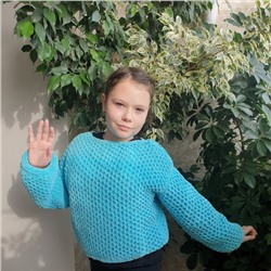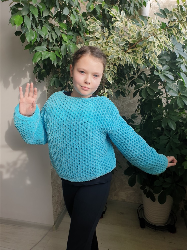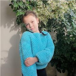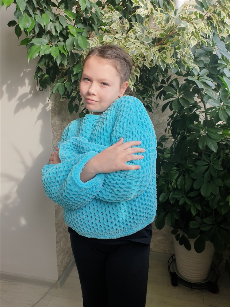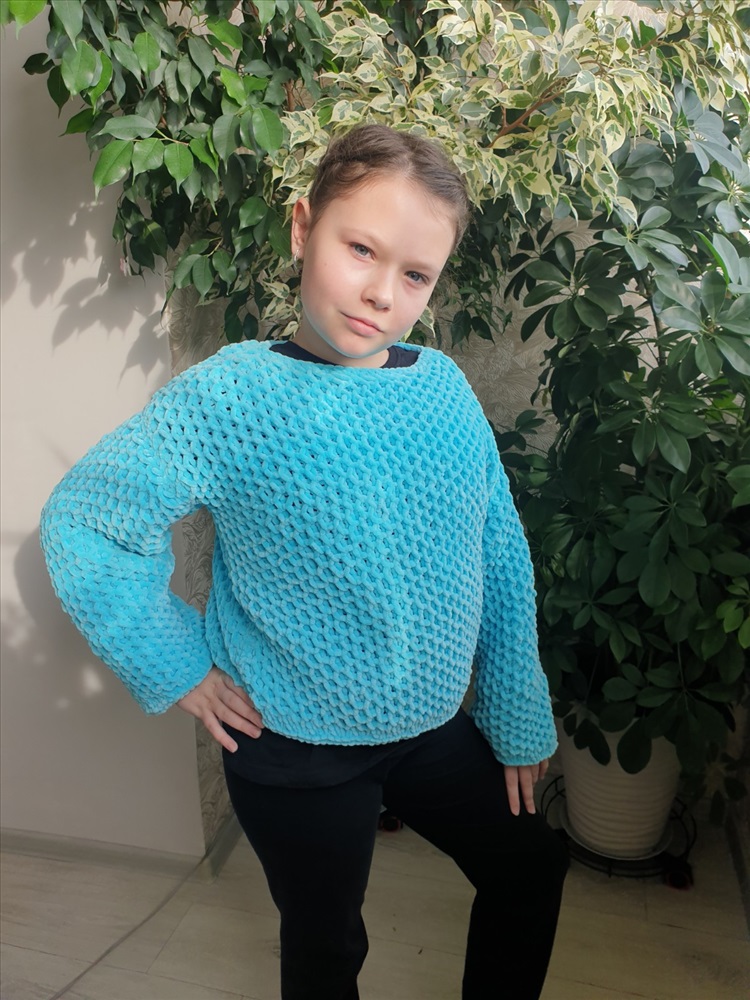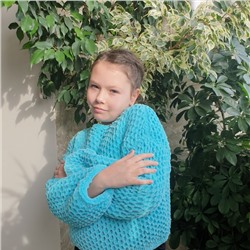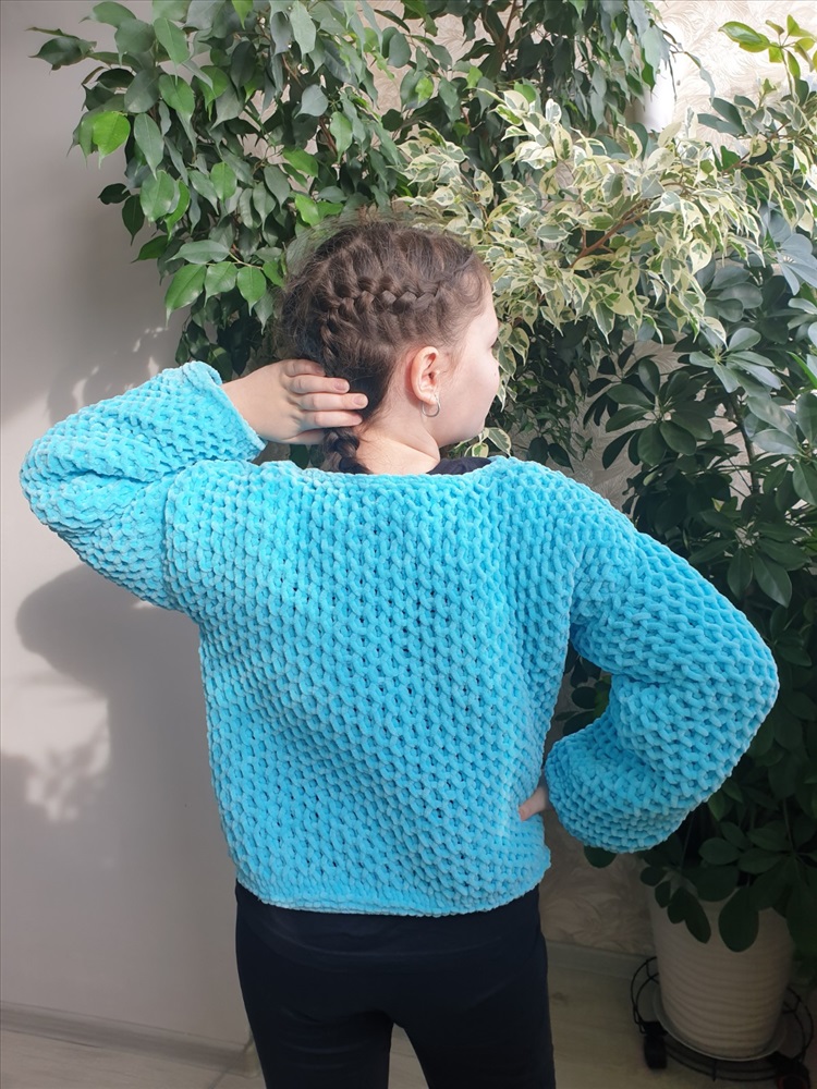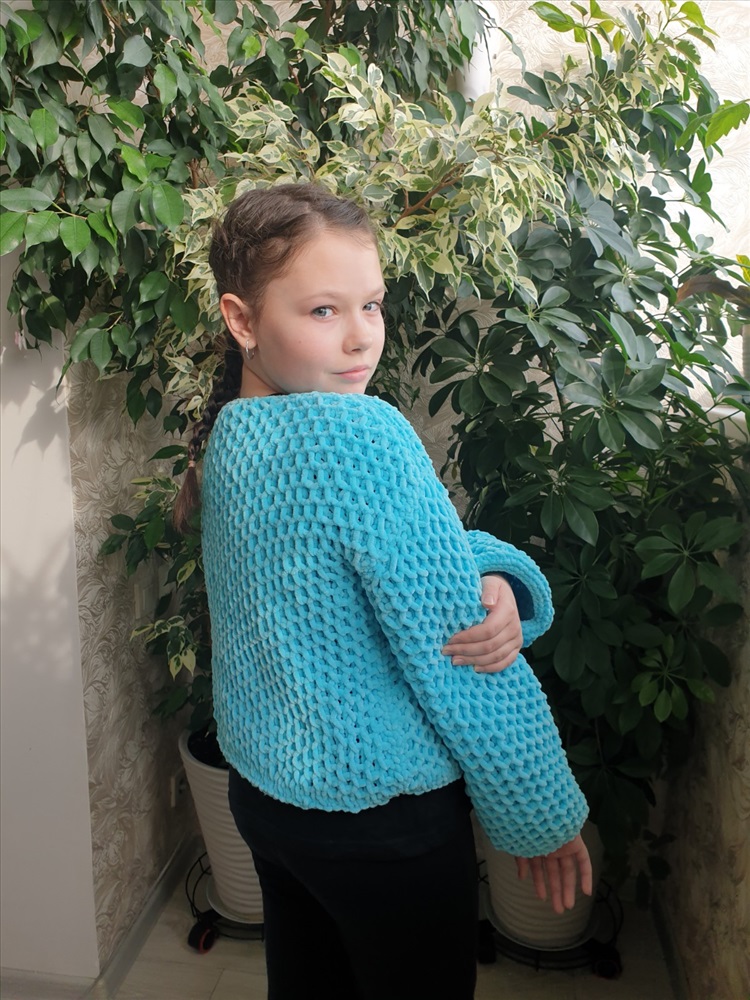 Заказала у девочек плюшевую пряжу HIMALAYA DOLPHIN BABY. Она чудесная! :о))) Сама нить довольно толстая, но вязать приятно. Нужно только учитывать нюансы плюшевой пряжи. Не любая вязка смотрится хорошо. Я выбрала объемные соты и связала доче кофточку свободного кроя. Она оооочень довольная! Смотрите фото! :о)))