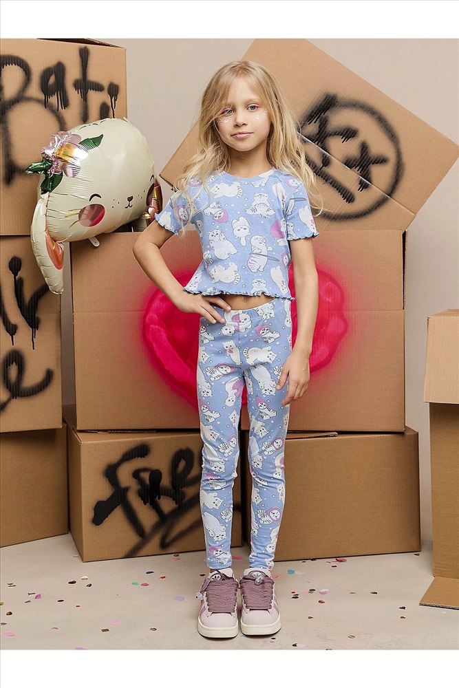 Страна производства: Россия Футболка для девочки c коротким рукавом голубая из кашкорсе. Стильная укороченная футболка с принтом в виде очаровательных котиков. Круглая горловина, низ и рукава с фигурным срезом.