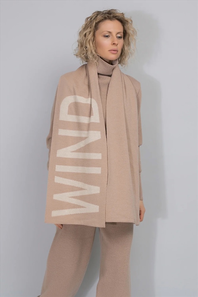 Двусторонний шарф из полушерсти с вывязанным рисунком в виде надписи WIND. Длина - 180 см, ширина - 30 см. Связан гладью. Украшен фирменной этикеткой на внутренней стороне.