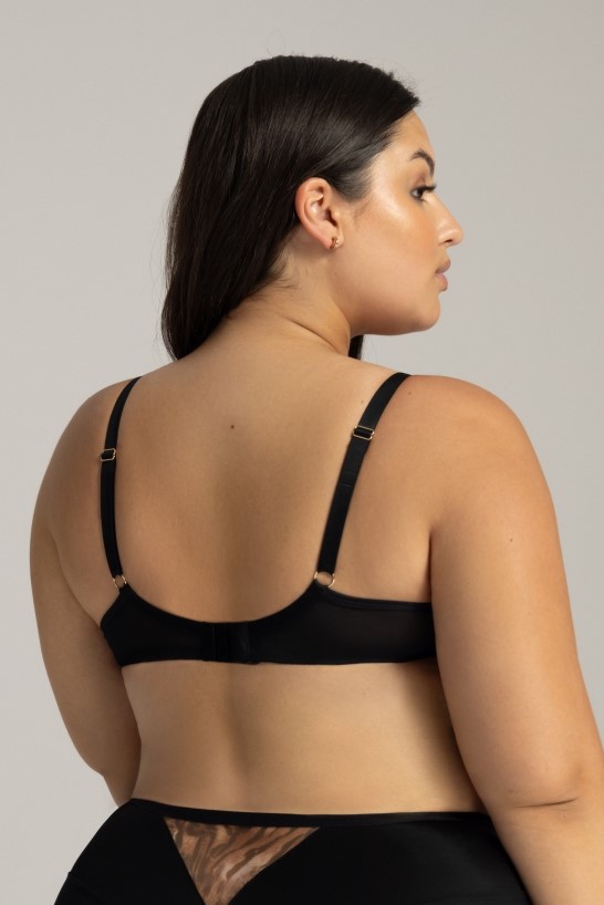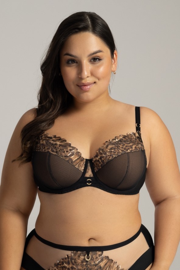 Состав: полиамид 82%, эластан 11%, полиуретан 5%, хлопок 2% Бюстгальтер 2143 PU LIANA выполнен на основе модели 1030 на косточках, чашки шитые, нижняя часть на тонком поролоне телесного цвета, внутри проложена хлопковым трикотажем, снаружи из черной сетки, верхняя часть чашки из телесной сетки, сложенной вдвое, и сетки с хищным принтом и вышивкой бежево-золотой нитью. Бретельки не отстёгиваются, регулируются по длине, фурнитура цвета желтого золота, пояс из эластичного сетчатого полотна разной степени плотности. На спине застёжка на удлинитель, количество крючков в ряду застёжки увеличивается пропорционально размеру бюстгальтера от 2 до 3. Бюстгальтер идеально сочетается с трусиками арт. 2143, 2144. Комментарии к товару