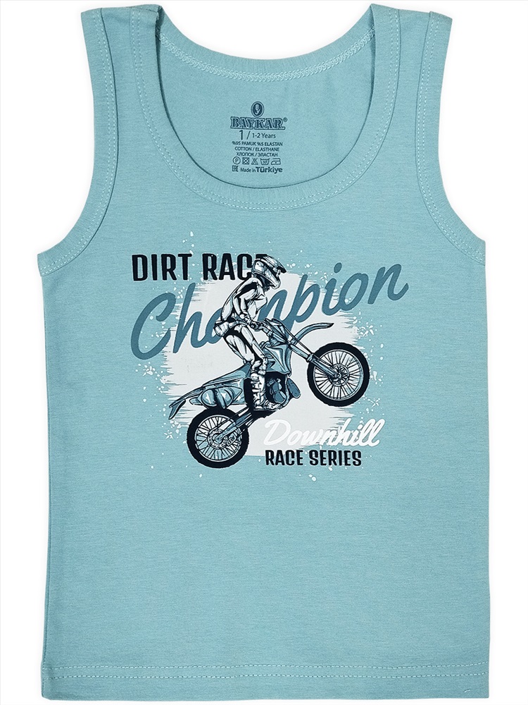 Майка для мальчика из эластичного х/б трикотажа, с ярким принтом "мотоцикл". Горловина и проймы отделаны эластичным, трикотажным кантом.