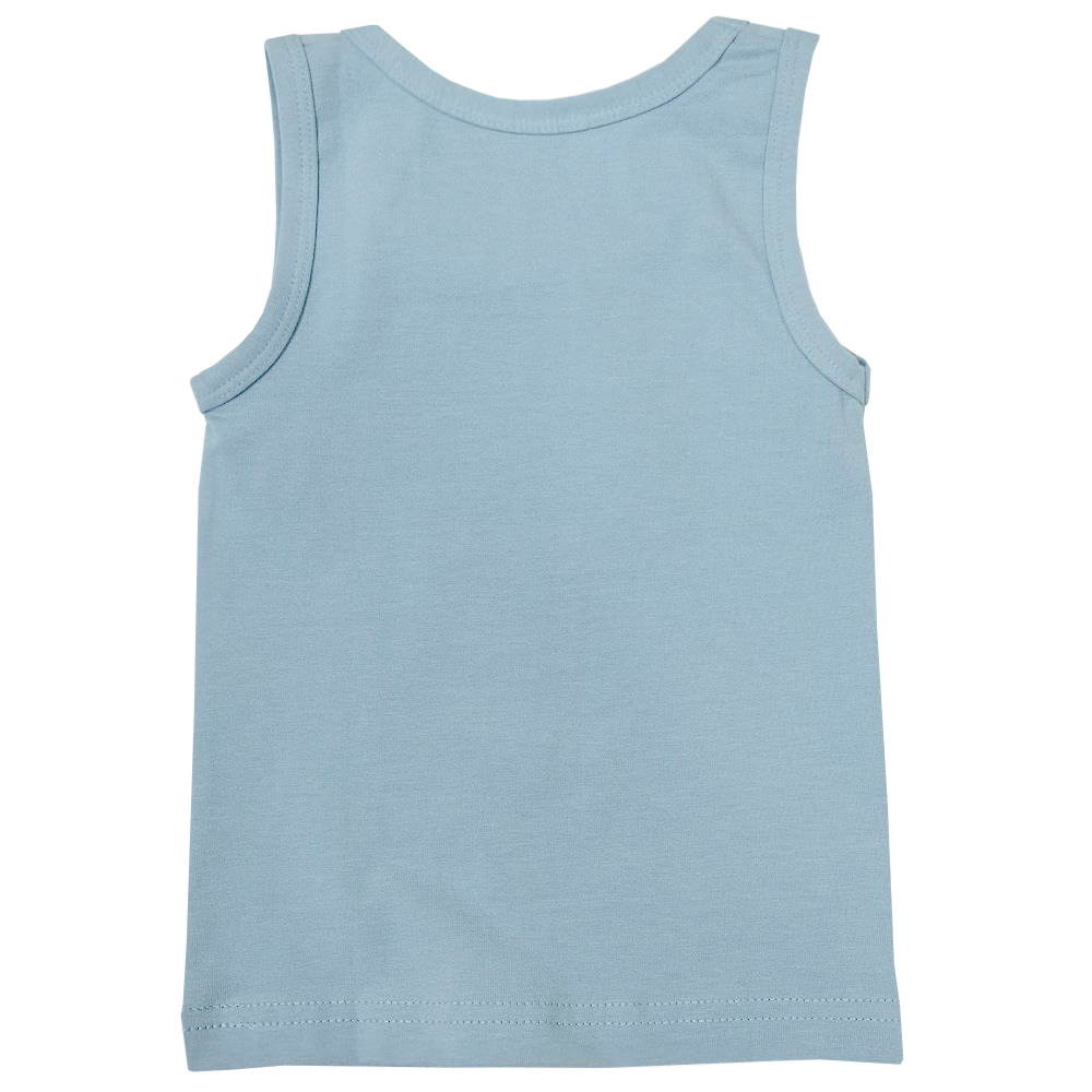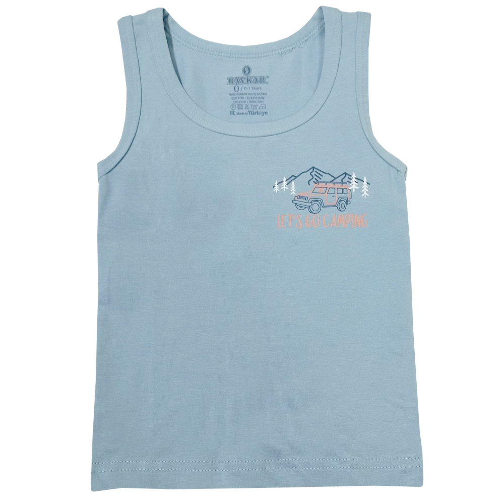 Майка для мальчика прямого кроя. Выполнена из хлопкового трикотажа кулирное полотно. Модель декорирована надписью на английском языке "отправиться в поход". Горловина и проймы отделаны эластичным трикотажным кантом. Широкие бретели. Низ изделия обработан швом вподгибку двойной строчкой.
