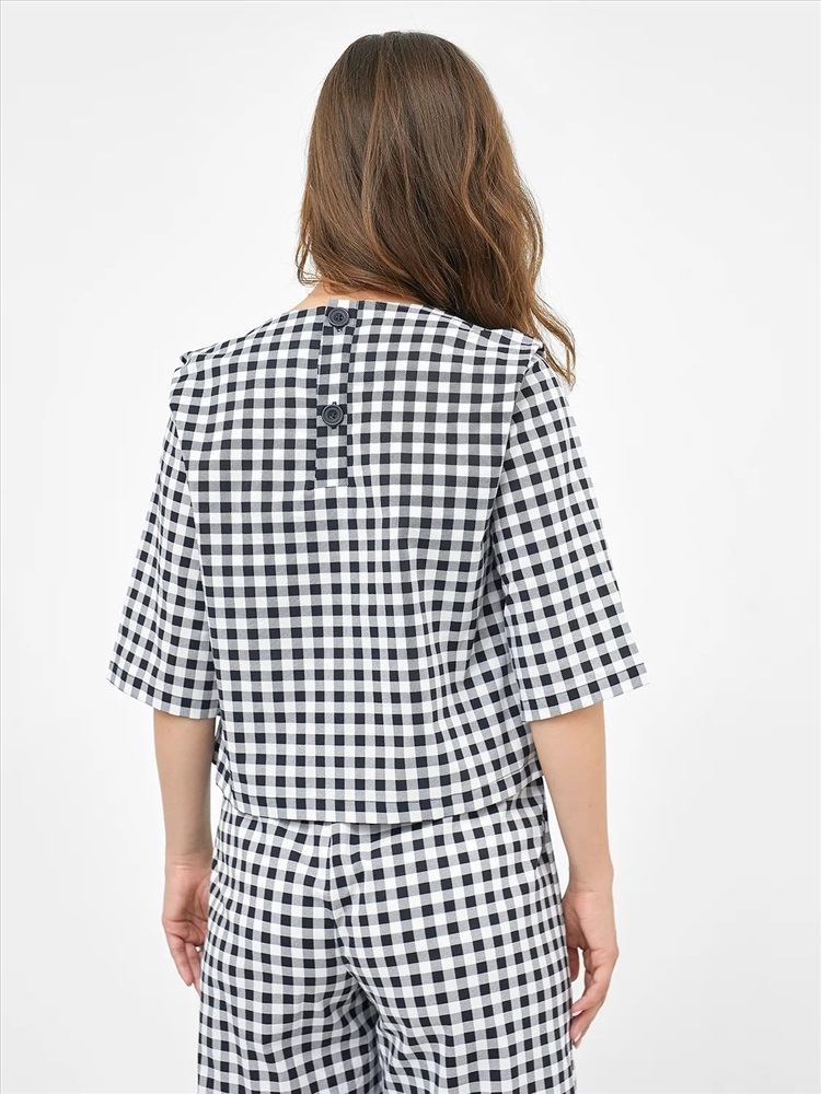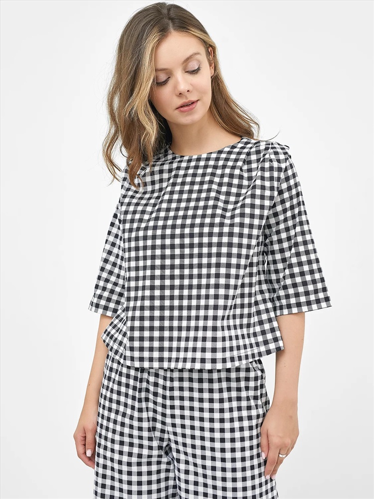 Российский размер: 42 Обхват груди: 84 Обхват бедер: 90 Артикул поставщика: 112764 Состав: 97% хлопок; 3% полиэстер Сезон: Весна, Лето Год: 2022 Страна: Беларусь Назначение: повседневная Вид застежки: пуговицы Вырез горловины: круглый Декоративные элементы: складки Тип рукава: 3/4 Пол: Женский фактура материала: тканое полотно Уход за вещами: деликатная стирка при 30 градусах Покрой: A-силуэт Рост: 170 Укороченная женская блузка А-образного силуэта из хлопкового поплина – плотного текстильного полотна, которое отлично держит форму. Сзади блузка застегивается на пуговицы. Рукава широкие и прямые, длиной до локтя. Линия плеча удлиненная, с необычной складочкой. Идеально решение для ваших стильных образов! Комментарии к товару