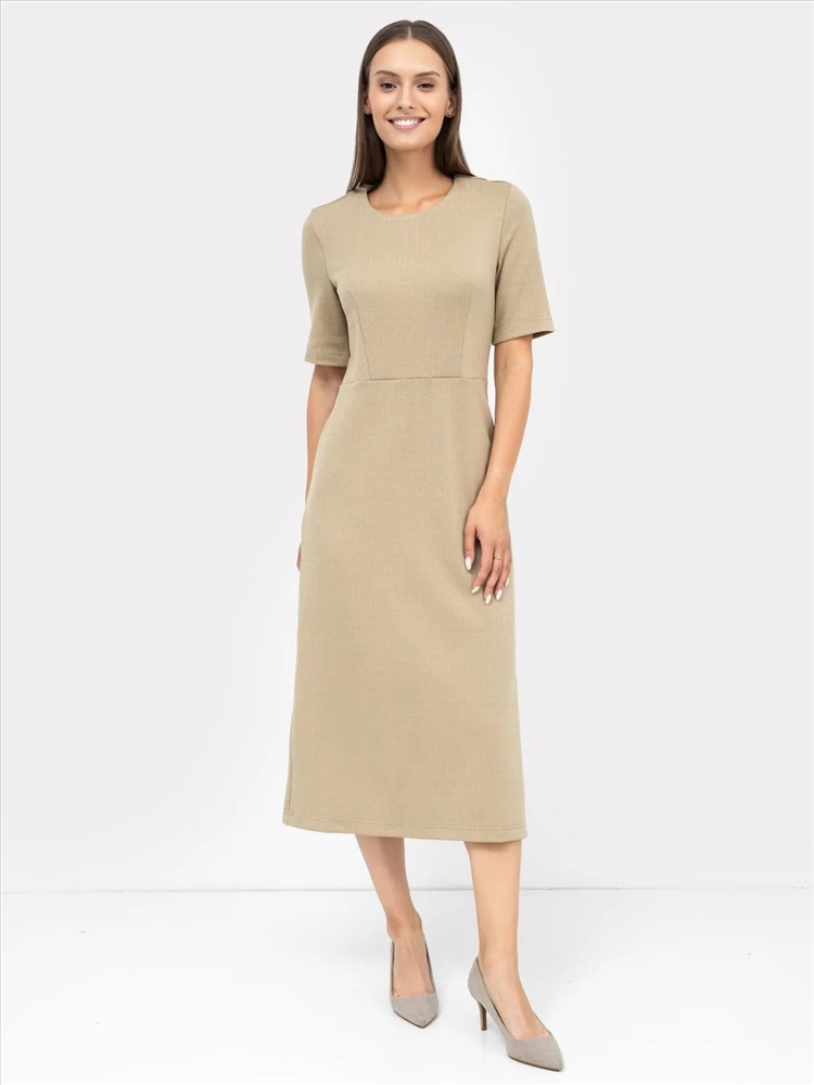 Рост: 164-170 Платье женское прилегающего силуэта из трикотажного полотна академик. На детали переда и спинки вытачки от талии. Спинка со средним швом и потайной молнией и разрезом по низу. Горловина круглой формы, обработана обтачкой из основного полотна. Рукав втачной, по локоть. Низ платья А-силуэта, с вытачками на задней детали. Длина ниже колена.