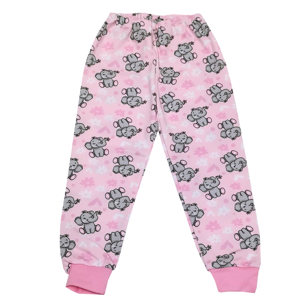 Брючки пижамные, из х/б трикотажа с красочным принтом "Слоник с цветочком". В поясе на закрытой резинке, снизу на трикотажных манжетах.