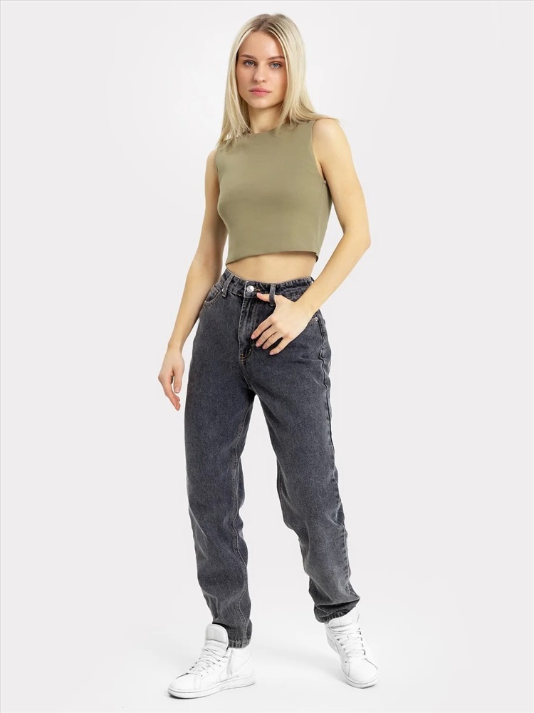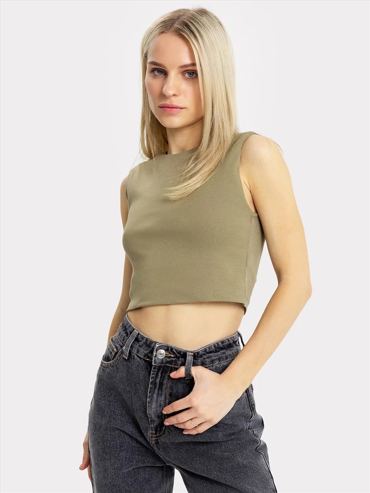 Обхват бедер: 106 Топ женский прилегающего силуэта из трикотажного полотна рибана. Горловина круглой формы. Передняя деталь топа двойная. Срезы горловины и пройм спинки окантованы бейкой. Топ укорочен.