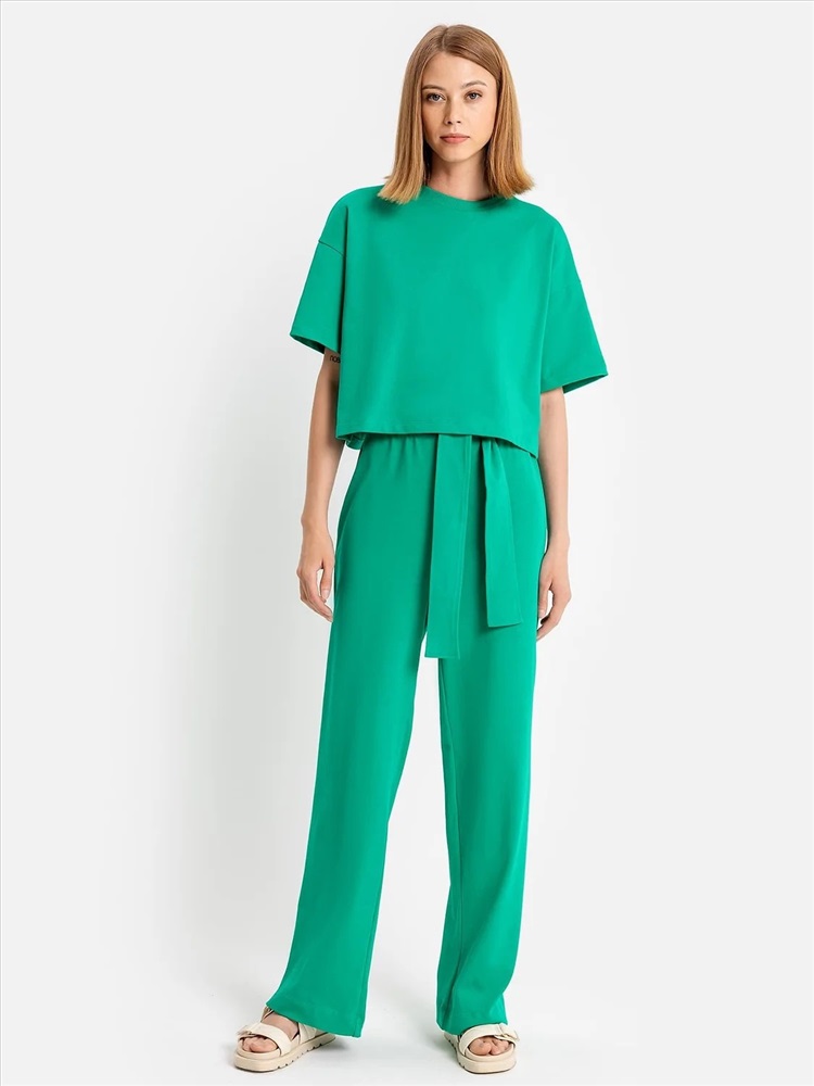 Российский размер: 42 Обхват бедер: 90 Артикул поставщика: 182474 Состав: 100% хлопок Сезон: Лето Год: 2023 Страна: Беларусь Утеплитель: без утепления Предмет: Брюки Пол: Женский Вид застежки: без застежки Модель брюк: прямые Уход за вещами: деликатная стирка при 30 градусах Декоративные элементы: без элементов Тип посадки: высокая Особенности модели: нет Тип карманов: без карманов Назначение: повседневная фактура материала: кулирное полотно Рост: 164-170 Наименование основного полотна - трикотажное полотно кулирка Брюки женские прямого силуэта из трикотажного полотна кулирка. Пояс отрезной с эластичной тесьмой внутри. Передняя деталь переда гладкая, задняя деталь пояса со сборкой. В боковые швы вставлен широкий пояс, который завязывается спереди. Брюки полной длины. Комментарии к товару