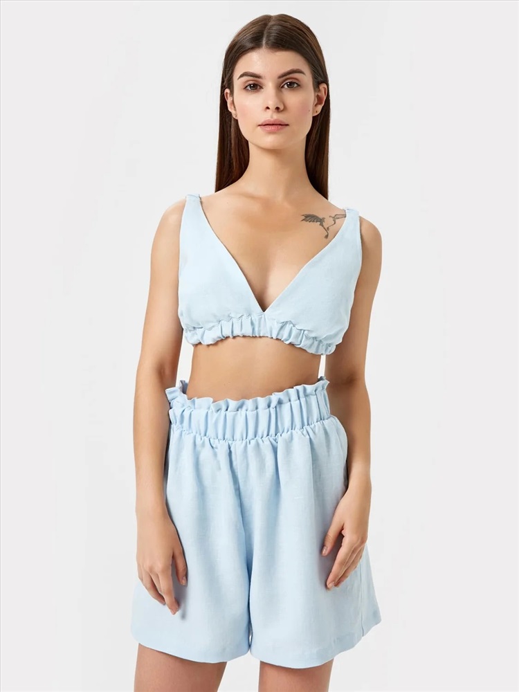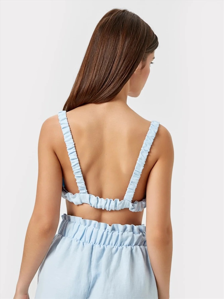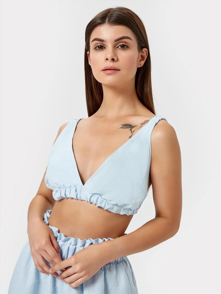 Обхват бедер: 98 Топ с треугольными чашками, на бретелях. Бретели с втаченой внутрь эластичной тесьмой, присборены. Низ изделия обработан поясом с втаченной эластичной тесьмой.