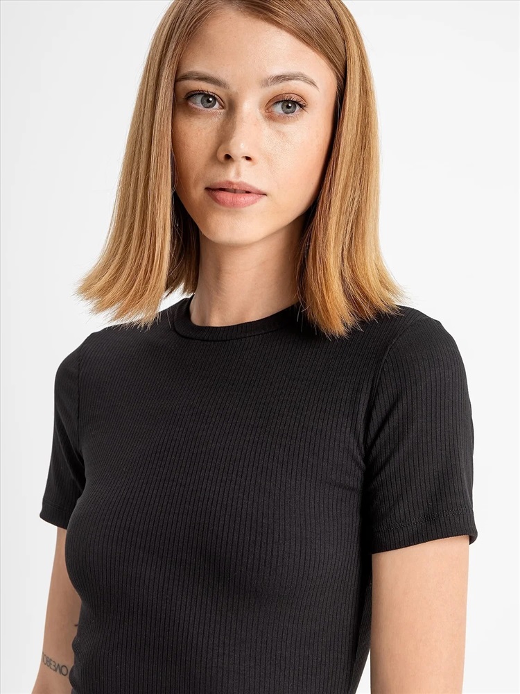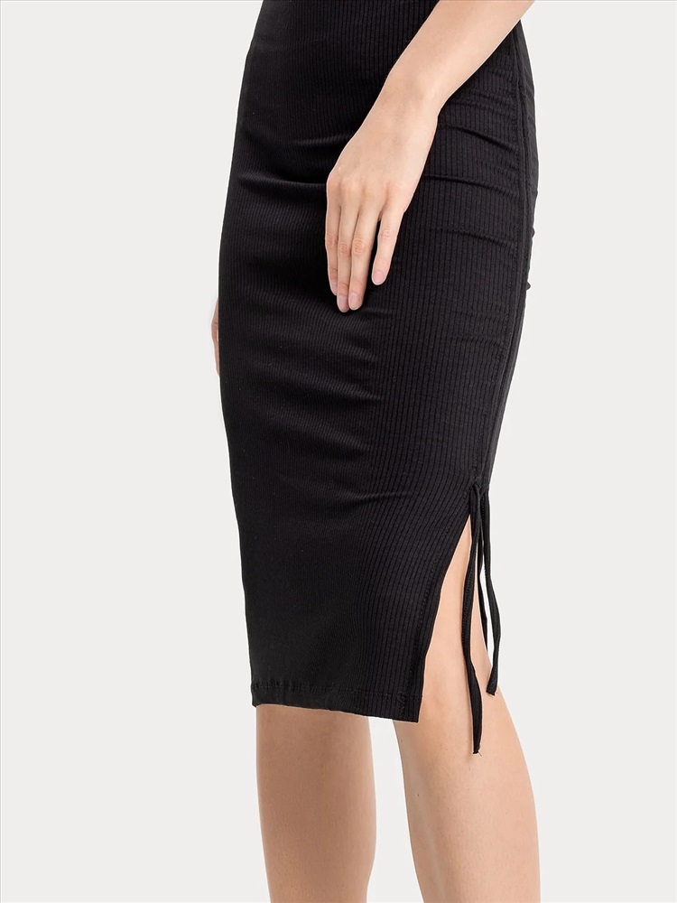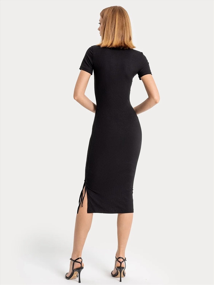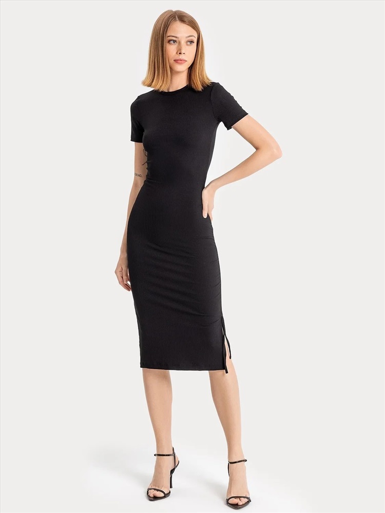 Рост: 164-170 Платье из рибаны прилегающего силуэта.Втачной рукав до середины плеча с небольшой свободой.Круглая горловина, прилегающая к шее, обработана отрезной обтачкой из основного полотна. Шов втачивания обтачки на участке горловины спинки обработан хб тесьмой.Вдоль левого бокового шва от линии талии до низа расположена кулиска из основного полотна. После сборки в шве разрез. Длина изделия до колена. Подгибка рукава и низа изделия обработаны на плоскошовной машине.