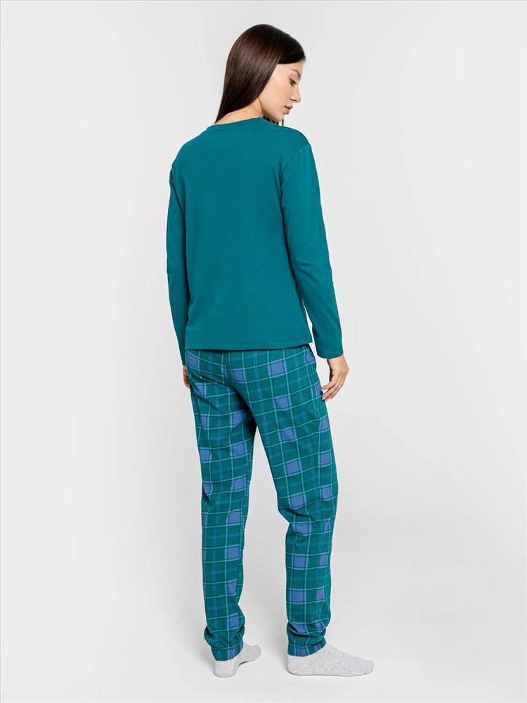 Рост: 164-170 Комплект для женщин состоит из джемпера и брюк. Горловина круглой формы с притачной обтачкой из основного полотна. Рукава длинные втачные. Перед и спинка цельнокроеные. Низ джемпера и рукавов обработан швом в подгибку. Брюки длинные, немного заужены к низу. Пояс цельнокроенный с эластичной тесьмой внутри. Низ брюк застрочен с эластичной тесьмой внутри.