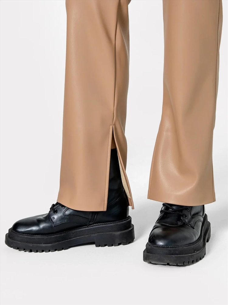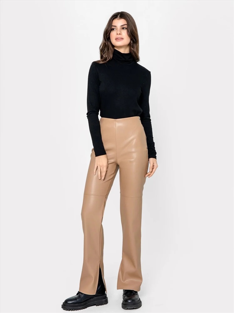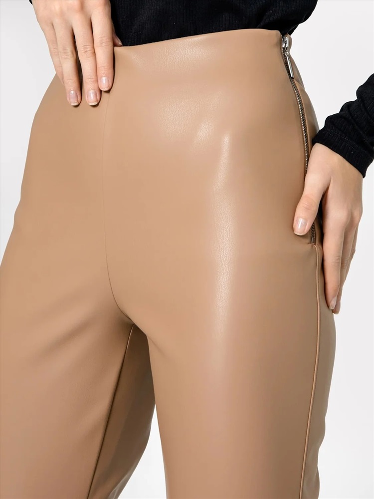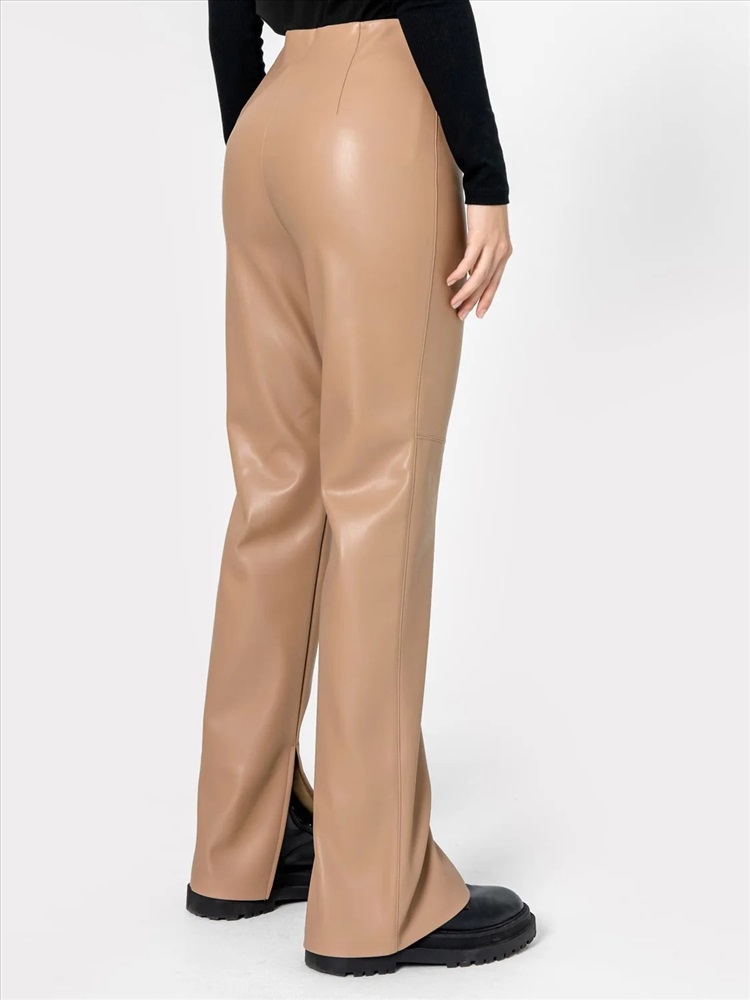 Рост: 164-170 Брюки женские прямого силуэта из трикотажного полотна под «кожу». Пояс цельнокроенный внутри обработан жаккардовой тесьмой. В боковом шве обработана застежка на молнию. На задней детали вытачки. На передних деталях членение чуть выше колена. Боковые швы с отделочной строчкой. По низу, по внутреннему шву обработан разрез.