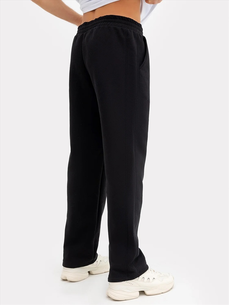 Вид застежки: без застежки Брюки мужские из трикотажного полотна футера. Брюки прямые, посадка средняя. Пояс отрезной с эластичной тесьмой внутри. С внутренней стороны пояса пробиты петли и втянут шнур с застроченными концами. Брюки с отрезной боковой вставкой. По переду обработаны карманы-хулиганы, подкладка кармана из кулирки.