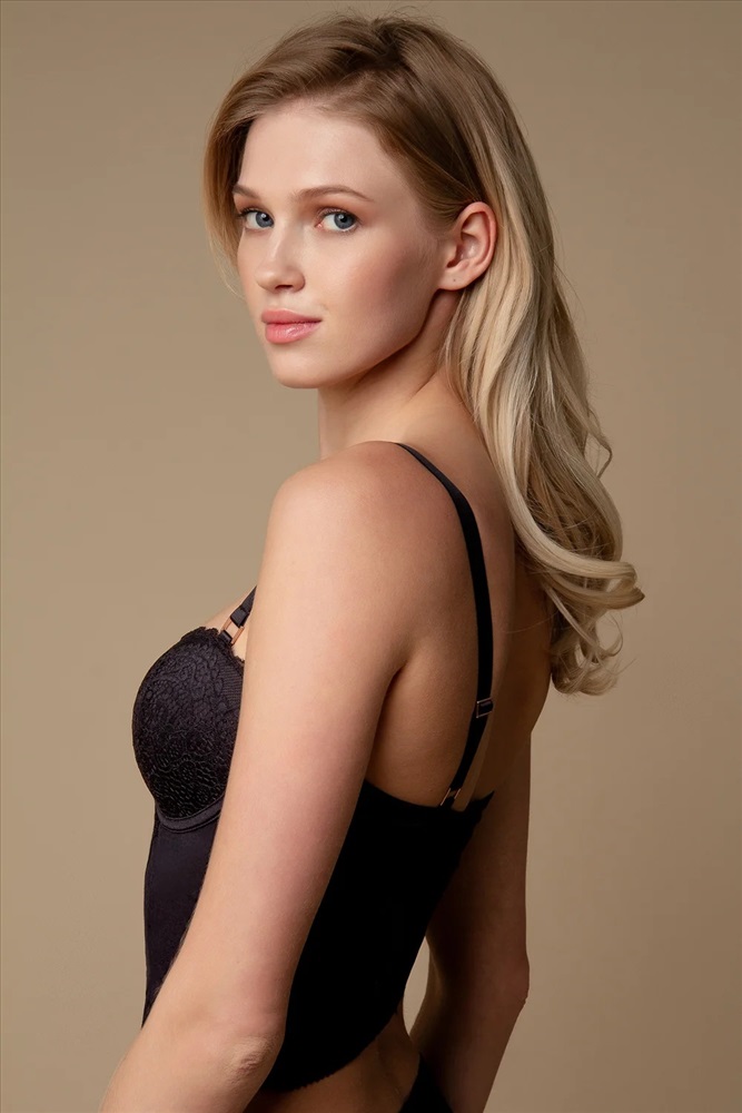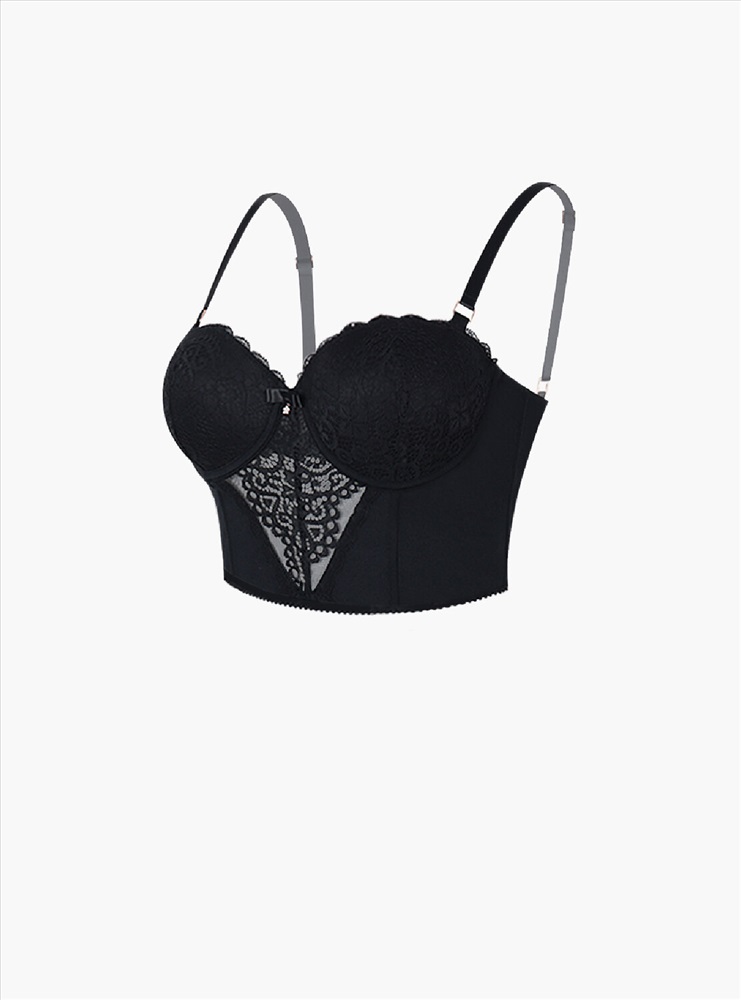 Корсет изготовлен из полиамида - прочного и эластичного материала, который обеспечивает комфорт и долговечность изделия. Модель имеет V-образный вырез с кружевом на передней части. Бретели регулируются, поэтому можно настроить оптимальную длину под вашу фигуру. Сзади находятся застежки, что придаст легкость и удобство при надевании и снятии корсета.