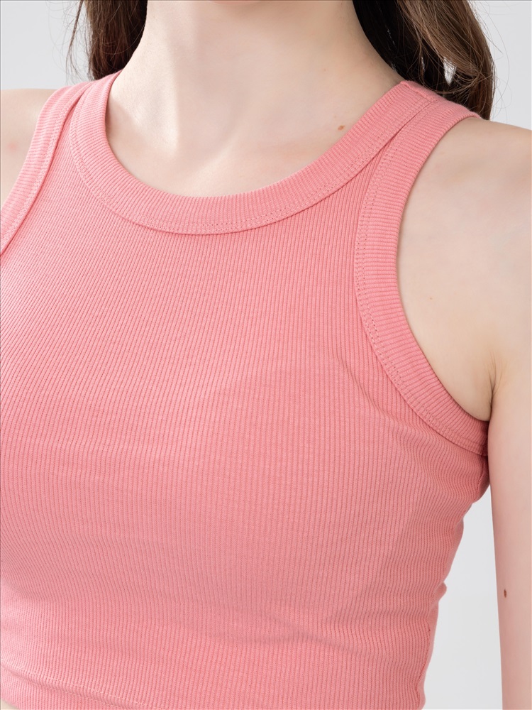 Топ для девочки из эластичного х/б трикотажа в мелкий рубчик (рибана). Низ топа обработан швом вподгибку. Горловина и проймы отделаны широкой бейкой из основного полотна.