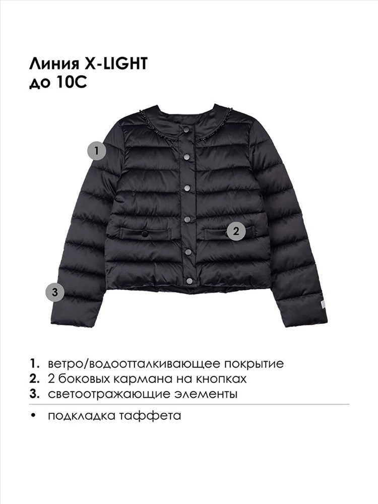 Российский размер: 134 Рост: 134 Возраст: 9 Обхват шеи: 29,9/28,6 Артикул поставщика: 22427001 Год: 2024 Легкая демисезонная куртка для девочки подростка. Температурный режим до 10°С*. Линия X-LIGHT - вариант для теплой весны и ранней осени. Модная подростковая куртка с ветрозащитным и водоотталкивающим покрытием. Гладкая подкладка максимально комфортна для надевания изделия. Два боковых кармана на кнопках. Светоотражающие элементы. Куртка (осень) будет актуальна в школу, а также для повседневных прогулок. *Пожалуйста, обратите внимание, что указанный температурный режим является приблизительным и зависит от многих факторов, таких как возраст, физическое состояние, уровень активности ребенка и количество слоев одежды. Время, проведенное на открытом воздухе, и погодные условия, такие как холодный ветер, могут повлиять на тепловые характеристики изделия. Убедитесь, что защищены от холода голова, руки и ноги. Комментарии к товару