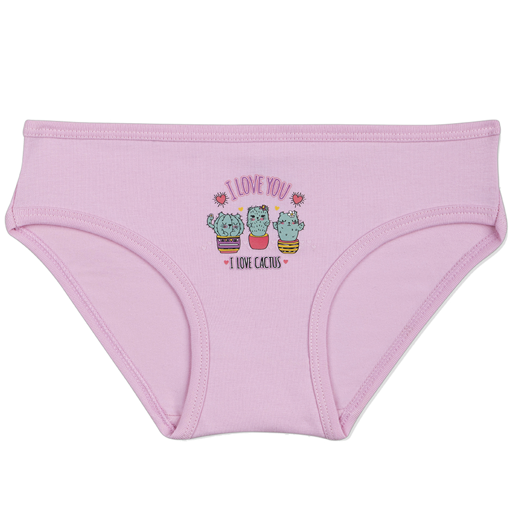 Трусы-слипы для девочки. Выполнены из эластичного х/б трикотажа кулирное полотно. Передняя половинка декорирована принтом "Кактусы". В поясе и проймах отделаны эластичным трикотажным кантом. Хлопковая ластовица.