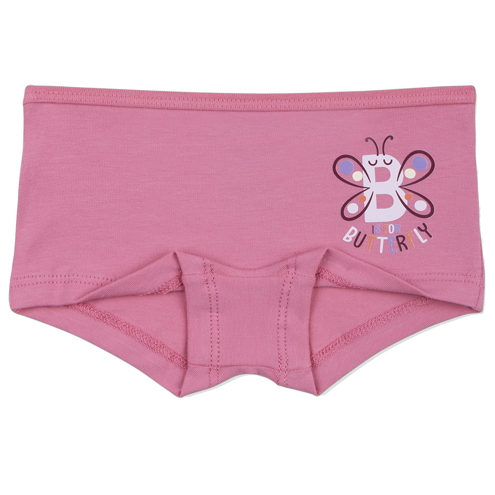 Трусы-шорты для девочки. Выполнены из эластичного х/б трикотажа кулирное полотно. Передняя половинка декорирована надписью на английском языке "Butterfly". В поясе отделаны эластичным трикотажным кантом в тон полотна. Хлопковая ластовица. В проймах с подворотом.