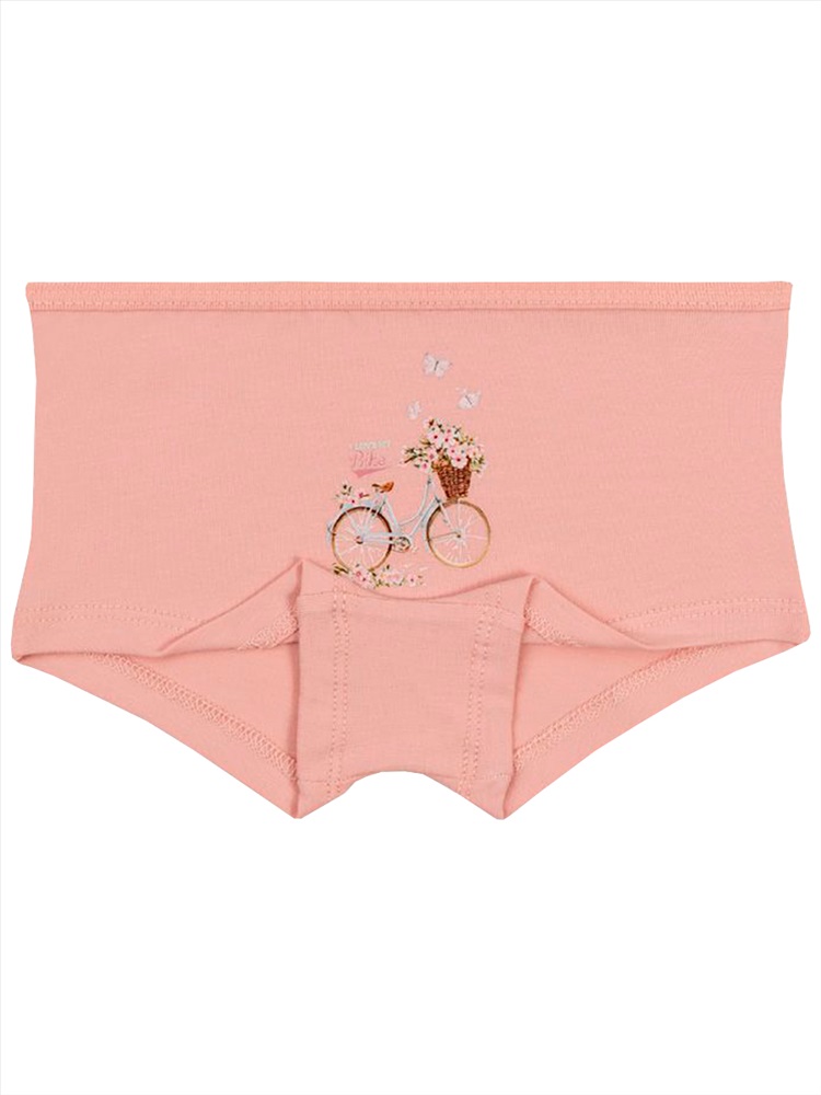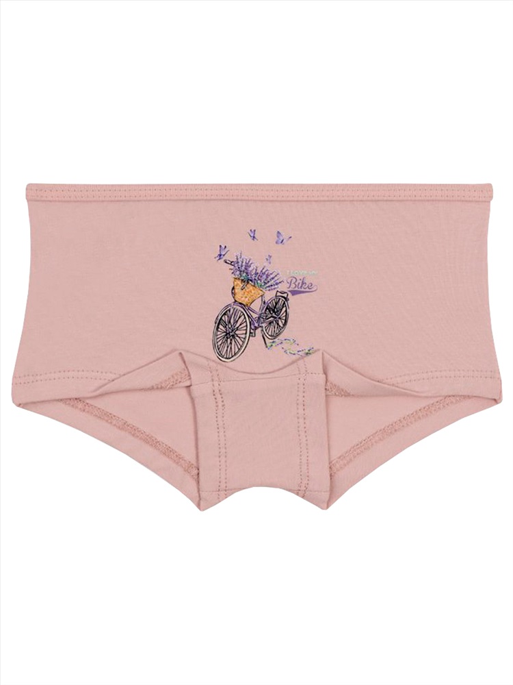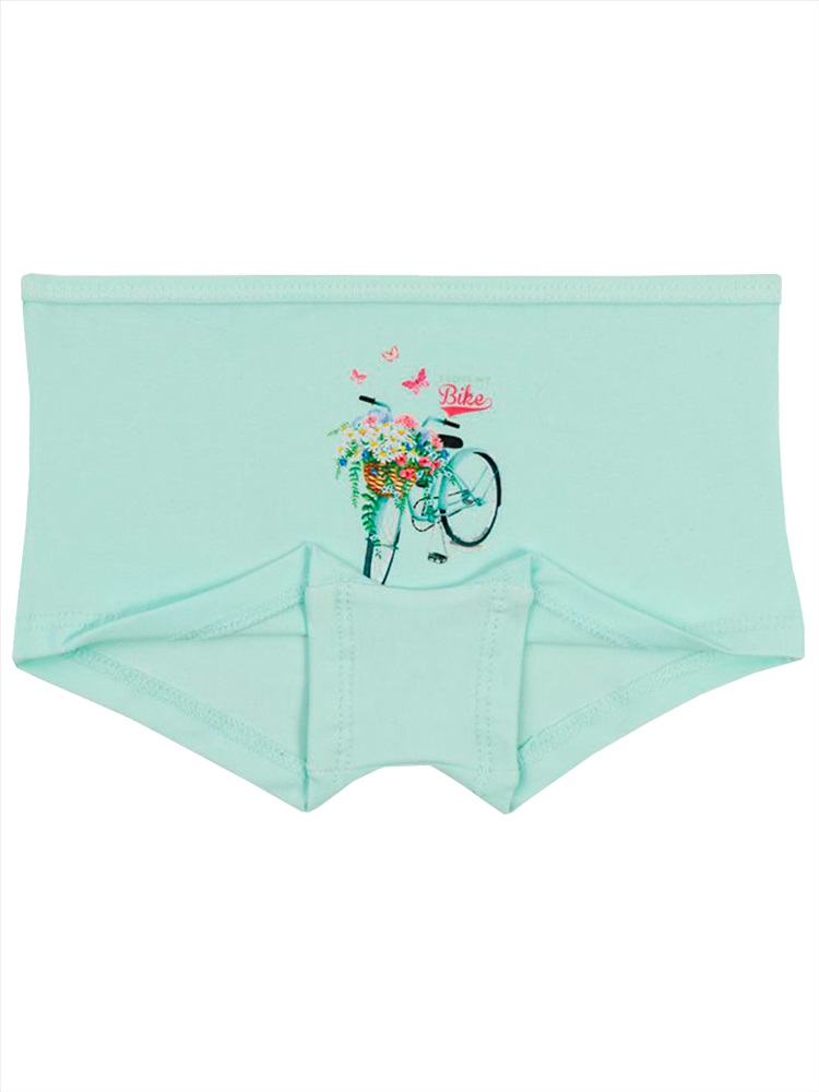 Трусы-шорты для девочки. Выполнены из эластичного х/б трикотажа кулирное полотно. Передняя половинка декорирована принтом нежным принтом. Пояс отделан трикотажным кантом из основного полотна. В проймах обработаны швом вподгибку двойной строчкой. Хлопковая ластовица.