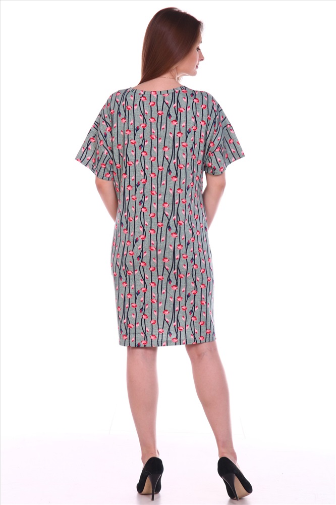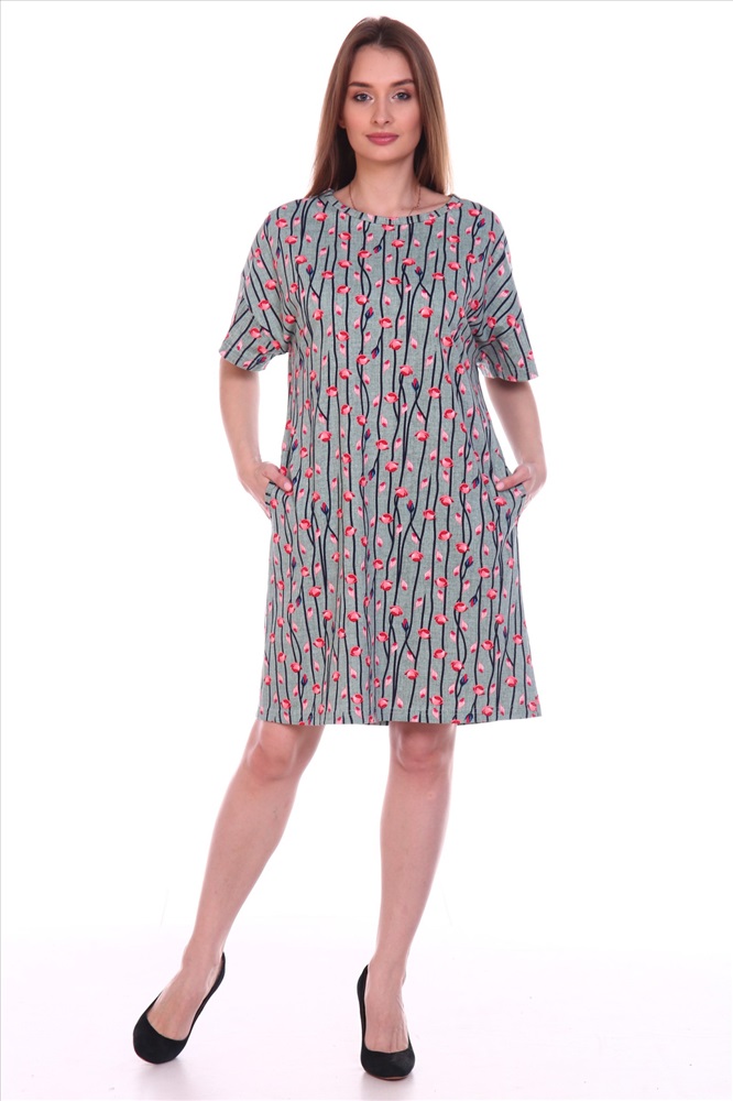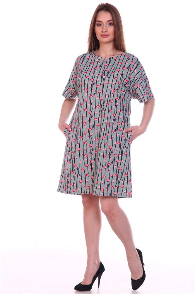 Платье свободного прямого силуэта из набивного полотна кулирка с коротким втачным рукавом.Пройма спущена,присутствуют карманы в боковых швах.Круглая горловина и вход в карман окантованы,низ изделия и рукава обработаны швом в подгибку.Удобное и комфортное платье для повседневной носки.