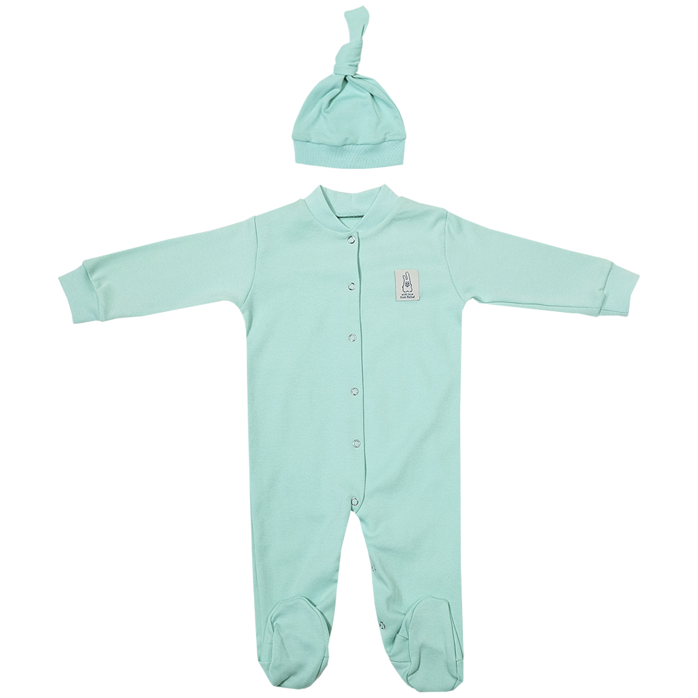 Комплект для новорожденных, состоящий из комбинезона и шапочки. Выполнен из однотонного трикотажного полотна -интерлок, нежный и приятный к телу 100% хлопок.