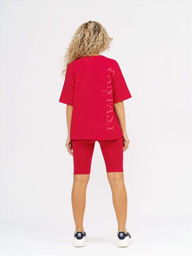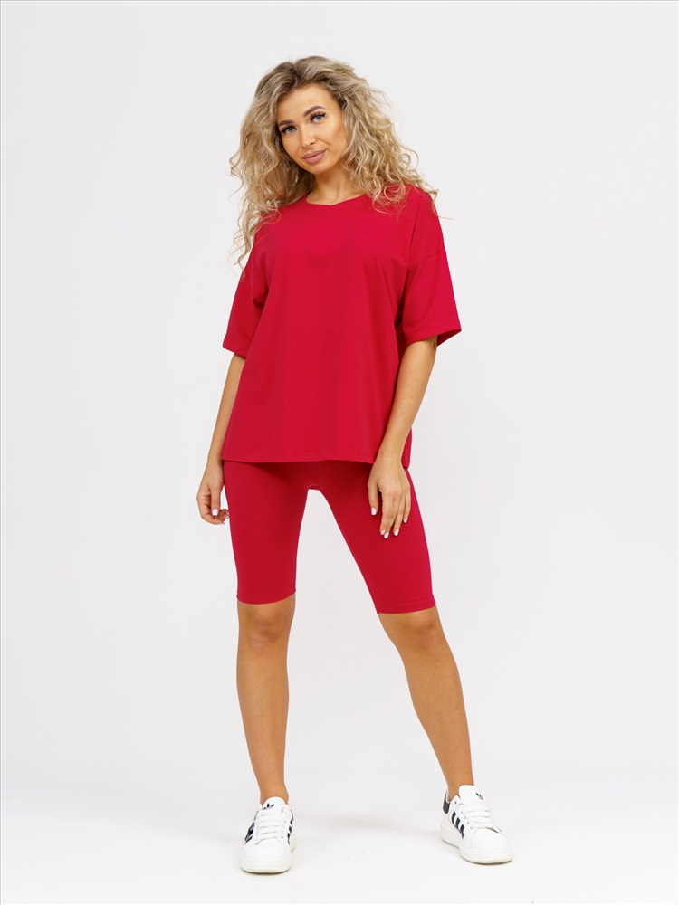 Состав: 92% хлопок 8% лайкра кулирка с лайкрой пенье Стильный женский костюм двойка в стиле спорт-шик – идеальное сочетание комфорта, уюта и модного дизайна. Этот трикотажный комплект состоит из длинной футболки оверсайз с модным принтом на спине и облегающих шорт-велосипедок, которые вместе создают гармоничный и женственный образ. Футболка свободного кроя с коротким рукавом  идеально сочетается с велосипедками на эластичной резинке, которые мягко облегают фигуру, подчеркивая все преимущества силуэта. Высококачественное трикотажное полотно приятно к телу, обеспечивает комфорт и тепло в прохладную погоду, оставаясь легким и дышащим в теплое время года – это действительно универсальный комплект, для которого смена сезонов не имеет значения.