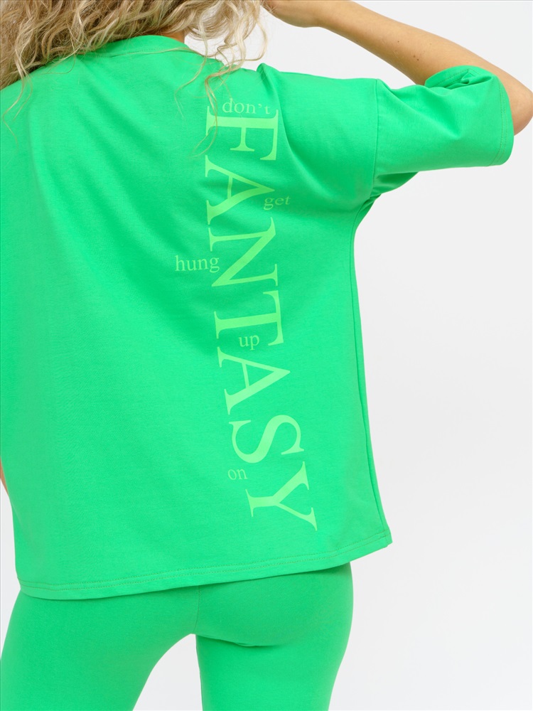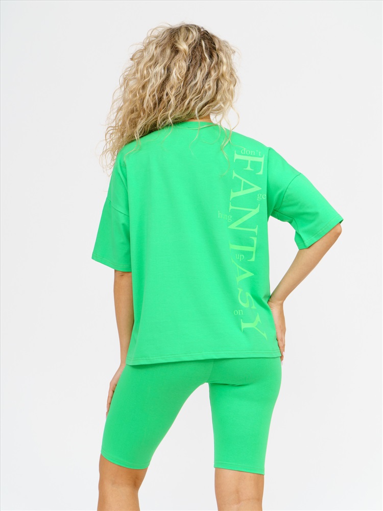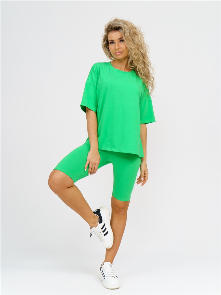 Стильный женский костюм двойка в стиле спорт-шик – идеальное сочетание комфорта, уюта и модного дизайна. Этот трикотажный комплект состоит из длинной футболки оверсайз с модным принтом на спине и облегающих шорт-велосипедок, которые вместе создают гармоничный и женственный образ. Футболка свободного кроя с коротким рукавом идеально сочетается с велосипедками на эластичной резинке, которые мягко облегают фигуру, подчеркивая все преимущества силуэта. Высококачественное трикотажное полотно приятно к телу, обеспечивает комфорт и тепло в прохладную погоду, оставаясь легким и дышащим в теплое время года – это действительно универсальный комплект, для которого смена сезонов не имеет значения.