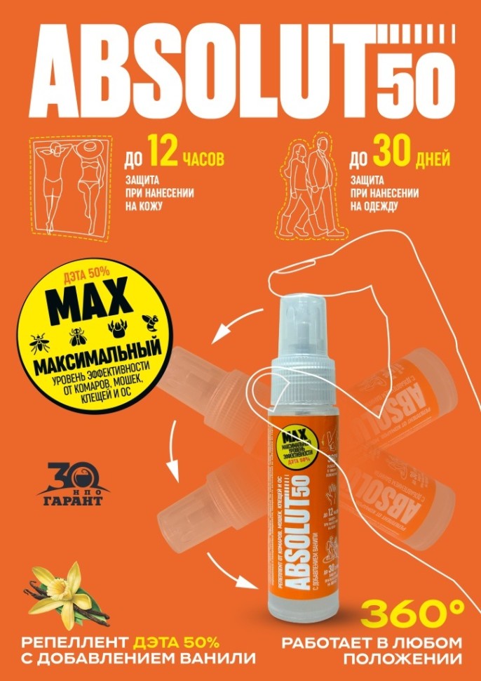 Содержит в качестве Активного действующего вещества самый известный в мире и эффективный репеллент – ДЭТА в самой высокой разрешенной в России концентрации – 50%, в связи с чем срок защитного действия при нанесении на кожу составляет 12 часов, на одежду до 30 суток.