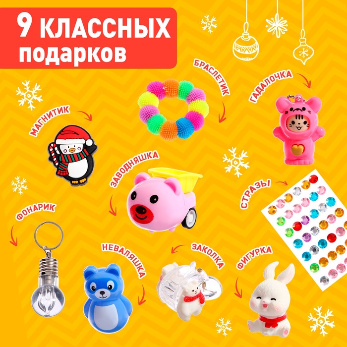 Производитель: Happy Valley; Габариты: 25 x 6 x 27,5; Страна: Китай; В боксе: 24 набор; Состав: Металл, пластик; Материалы: металл, пластик; Фасовка: по 1 набор; Индивидуальная упаковка: Картонная коробка; Габариты товара: 25 см × 6 см × 27,5 см; Сертификат: ЕАС; Для кого: Унисекс, Для девочки; Возраст: От 3 лет; В наборе, шт.: 9; Количество дней: 9; Вид упаковки: Подарочная коробка; Символ года: Нет; Тематика праздника: Новый год; Материал: Металл, Пластик; Составляющие набора: Фонарик, Стразы, Фигурка, Браслет, Игрушка, Магнит, Заколка