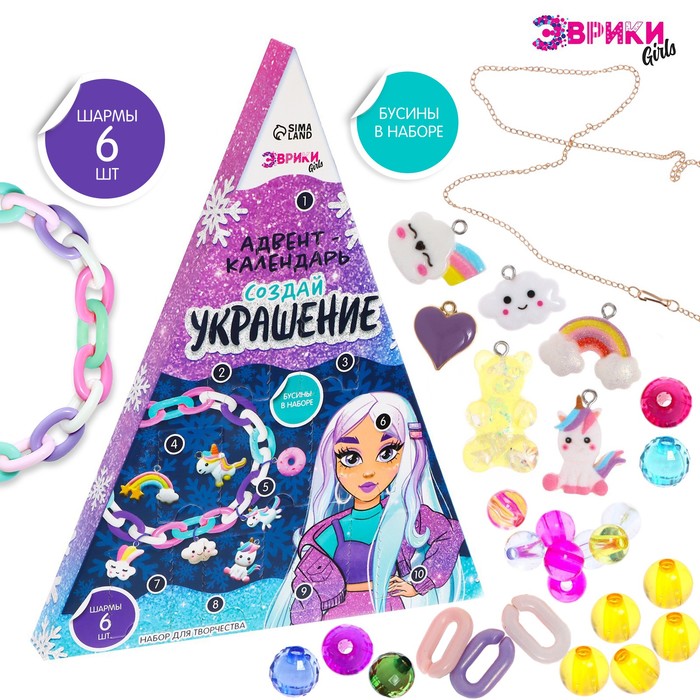 Адвент-календарь «Создай украшение» вдохновит на создание собственных маленьких шедевров! За 10 дней до Нового года открывайте по окошку и находите новые элементы для создания украшения. Внутри 6 шармов и множество других элементов для ваших изделий.