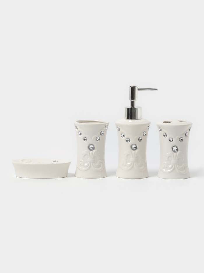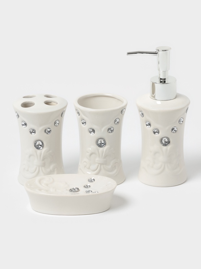 Набор аксессуаров организует пространство и станет стильным украшением Вашей ванной комнаты. За счет сдержанного дизайна данный керамический набор в ванную подойдет к любому дизайну ванной комнаты. Набор состоит из 4 предметов: 2 стакана, мыльница, дозатор.