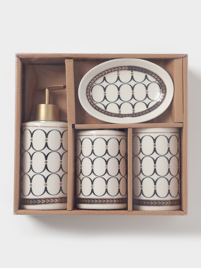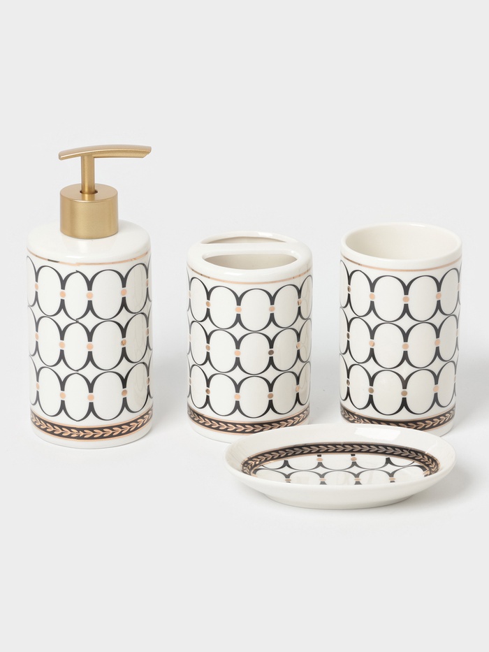 Набор аксессуаров организует пространство и станет стильным украшением Вашей ванной комнаты. За счет сдержанного дизайна данный керамический набор в ванную подойдет к любому дизайну ванной комнаты. Набор состоит из 4 предметов: 2 стакана, мыльница, дозатор.