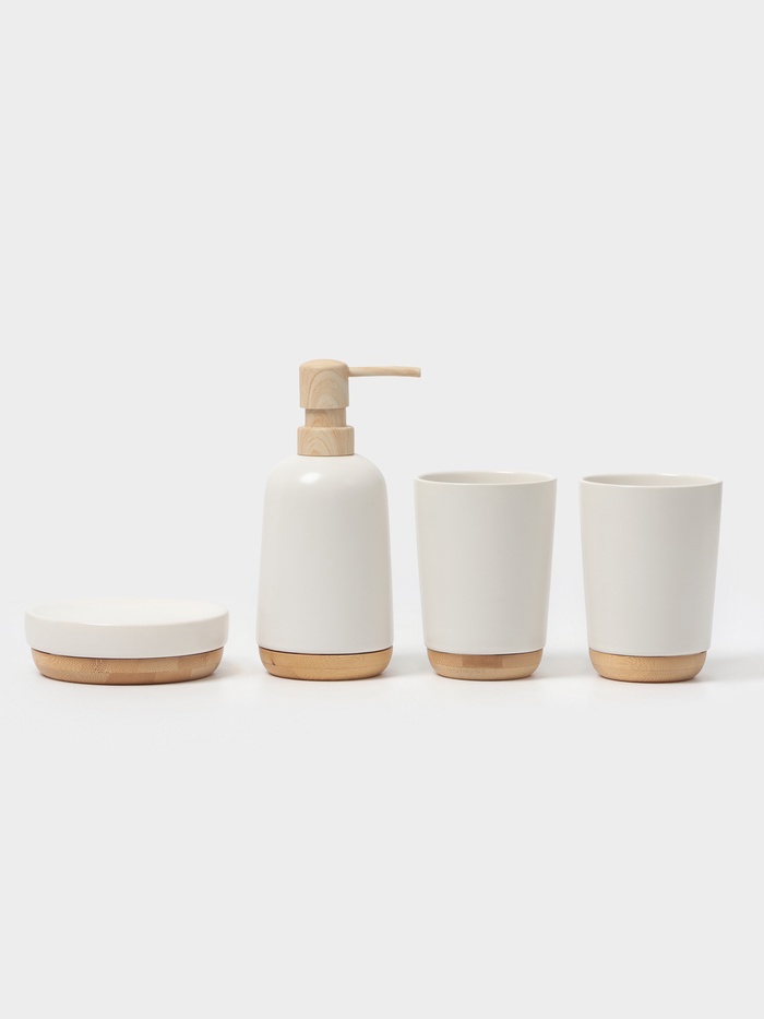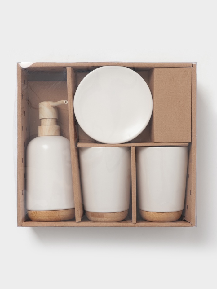 Набор аксессуаров организует пространство и станет стильным украшением Вашей ванной комнаты. За счет сдержанного дизайна данный керамический набор в ванную подойдет к любому дизайну ванной комнаты. Набор состоит из 4 предметов: 2 стакана, мыльница, дозатор.