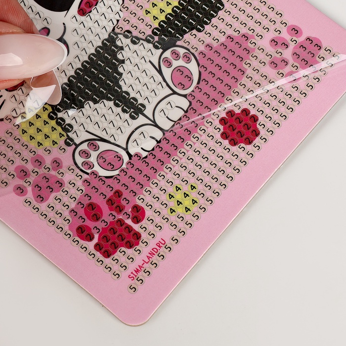 Ребёнку предстоит разложить кристаллики карандашом по пронумерованной схеме, заполнив всё полотно. Основа с клеевым покрытием будет надёжно удерживать стразы. На ней уже обозначены необходимые оттенки.