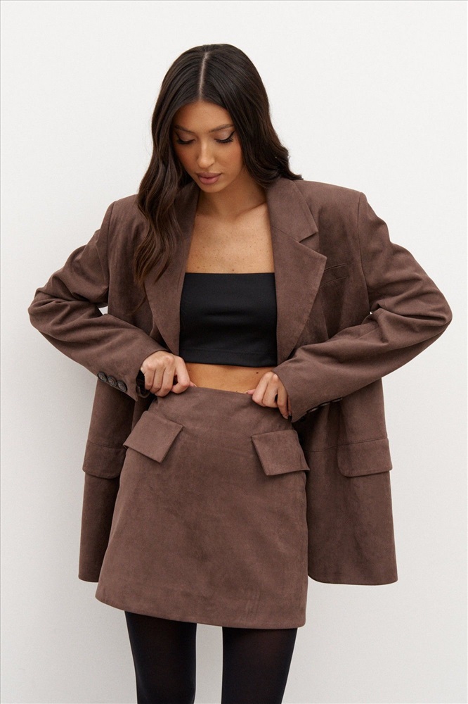 Юбка выполнена из мягкой ткани серо-коричневого цвета (искусственная замша). Характеристики: полуприлегающий А-образный силуэт, подкладка, застежка - потайная тесьма молния в среднем шве заднего полотна, по переду имитация карманов с клапаном. Длина по поковому шву 43 см.