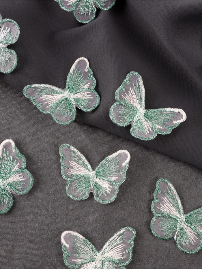 * С голографическим эффектом: Нити добавляют аппликациям переливы на свету, делая их похожими на крылья настоящих бабочек. Бирюзово-белая палитра усиливает ощущение свежести и движения.