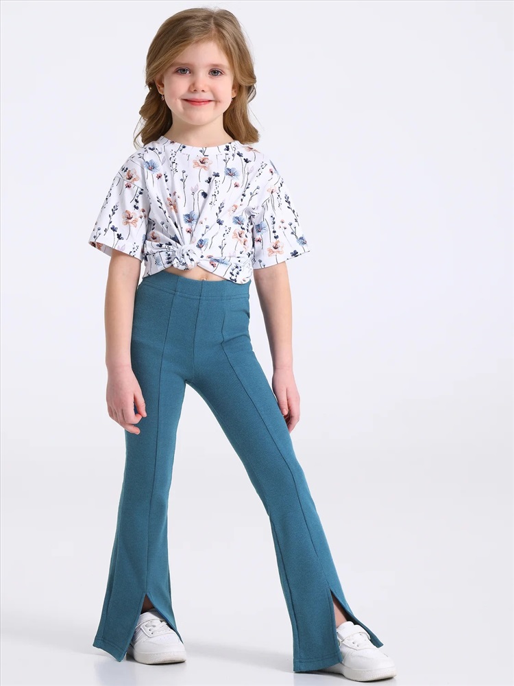 Брюки-клеш для девочки выполнены из ластика - эластичного хлопкового полотна в рубчик. Изделие со средней высотой посадки, на эластичном поясе, декорировано острочками-стрелкам и разрезами. Уход: только машинная стирка (руками не стирать!) при температуре 40 градусов, без предварительного замачивания.