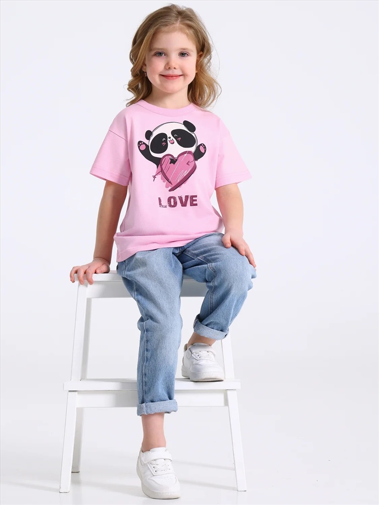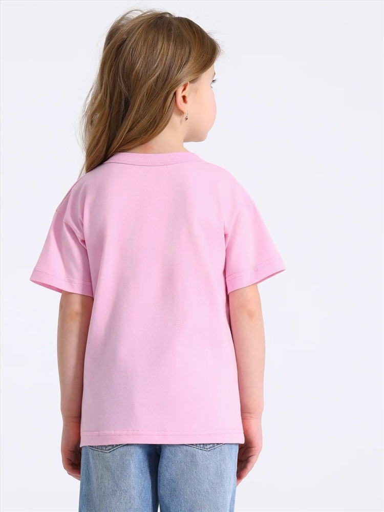 Футболка для девочки из кулира - легкого хлопкового полотна. Изделие с короткими рукавами со спущенным плечом, украшено печатью. Уход: только машинная стирка (руками не стирать!) при температуре 40 градусов, без предварительного замачивания. Изделия с печатью и декором перед стиркой необходимо вывернуть на изнаночную сторону.