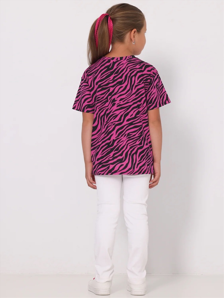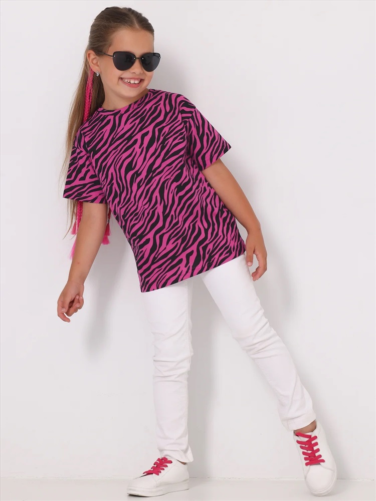 Футболка для девочки из кулира - легкого хлопкового полотна. Изделие с короткими рукавами со спущенным плечом, украшено стильным набивным принтом. Отличный выбор для юной модницы! Уход: только машинная стирка (руками не стирать!) при температуре 40 градусов, без предварительного замачивания.