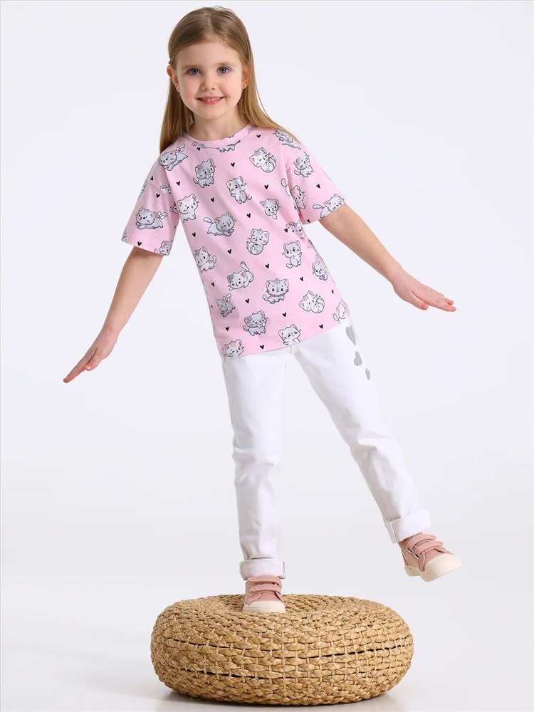 Футболка для девочки из кулира - легкого хлопкового набивного полотна. Изделие с короткими рукавами со спущенным плечом. Уход: только машинная стирка (руками не стирать!) при температуре 40 градусов, без предварительного замачивания.