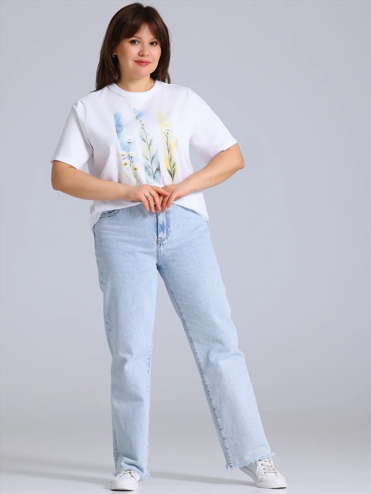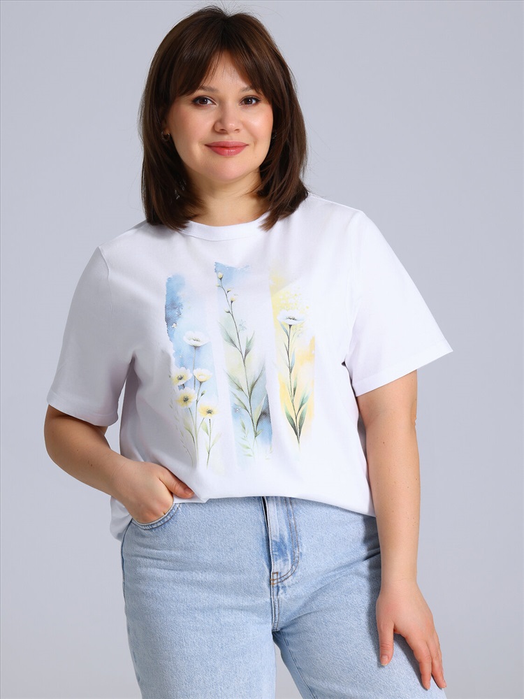 Футболка выполнена из кулира - легкого хлопкового полотна. Изделие прямого силуэта с короткими рукавами и круглым вырезом горловины, украшено печатью. Уход: только машинная стирка (руками не стирать!) при температуре 40 градусов, без предварительного замачивания. Изделия с печатью перед стиркой необходимо вывернуть на изнаночную сторону.
