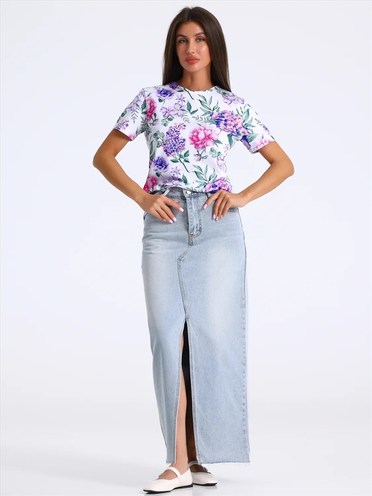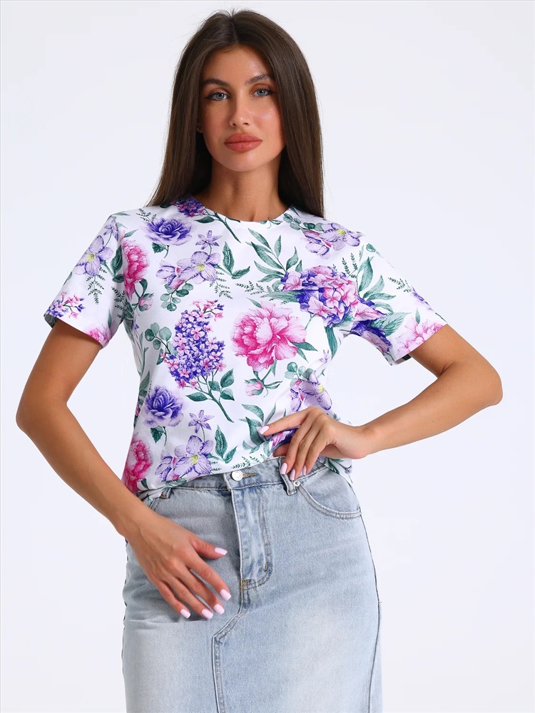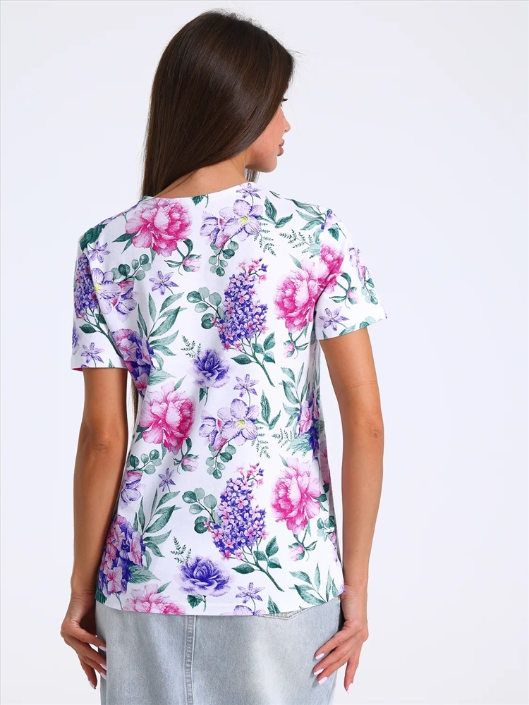 Футболка выполнена из кулира - легкого хлопкового полотна. Изделие свободного покроя с короткими рукавами и округлым вырезом горловины. Уход: только машинная стирка (руками не стирать!) при температуре 40 градусов, без предварительного замачивания.