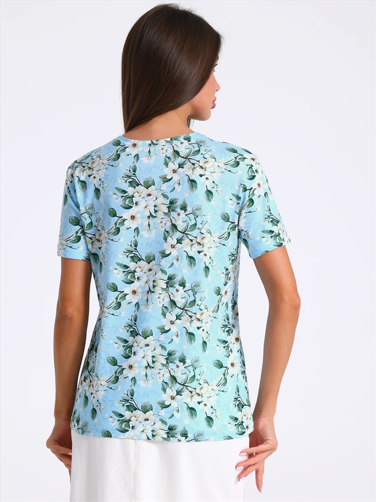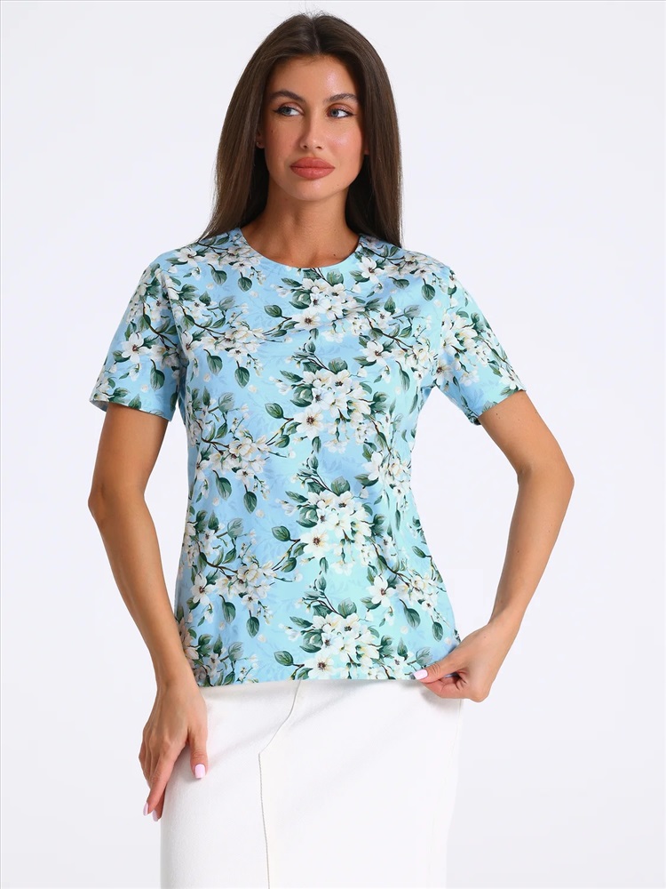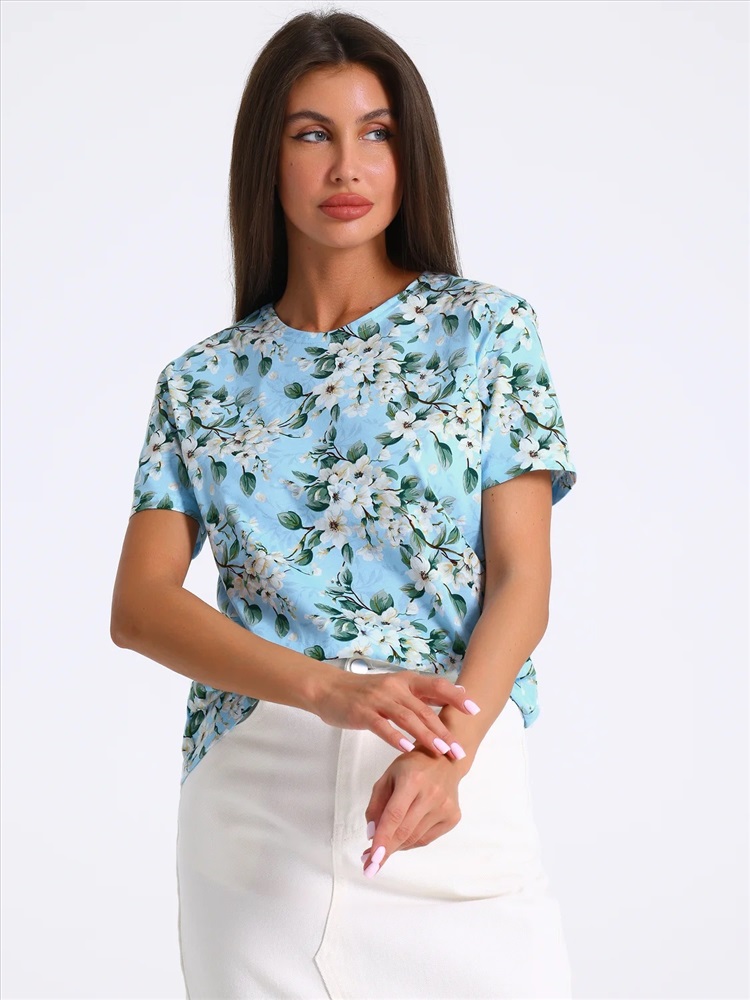 Футболка выполнена из кулира - легкого хлопкового полотна. Изделие свободного покроя с короткими рукавами и округлым вырезом горловины. Уход: только машинная стирка (руками не стирать!) при температуре 40 градусов, без предварительного замачивания.