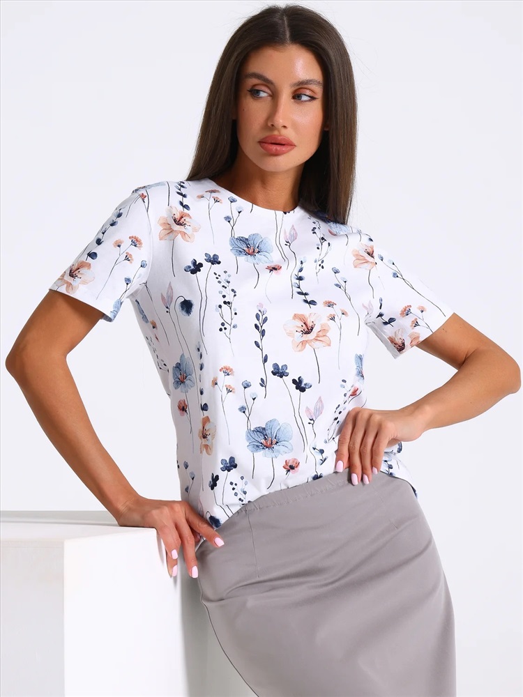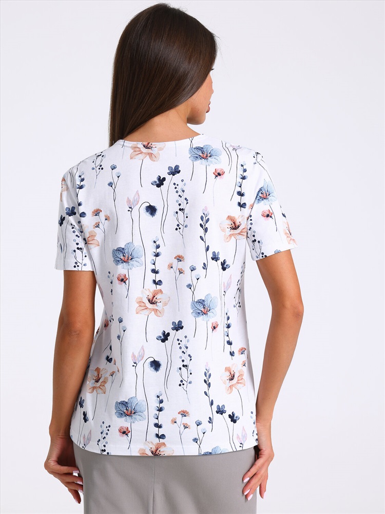 Футболка выполнена из кулира - легкого хлопкового полотна. Изделие свободного покроя с короткими рукавами и округлым вырезом горловины. Уход: только машинная стирка (руками не стирать!) при температуре 40 градусов, без предварительного замачивания.