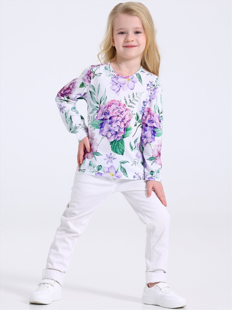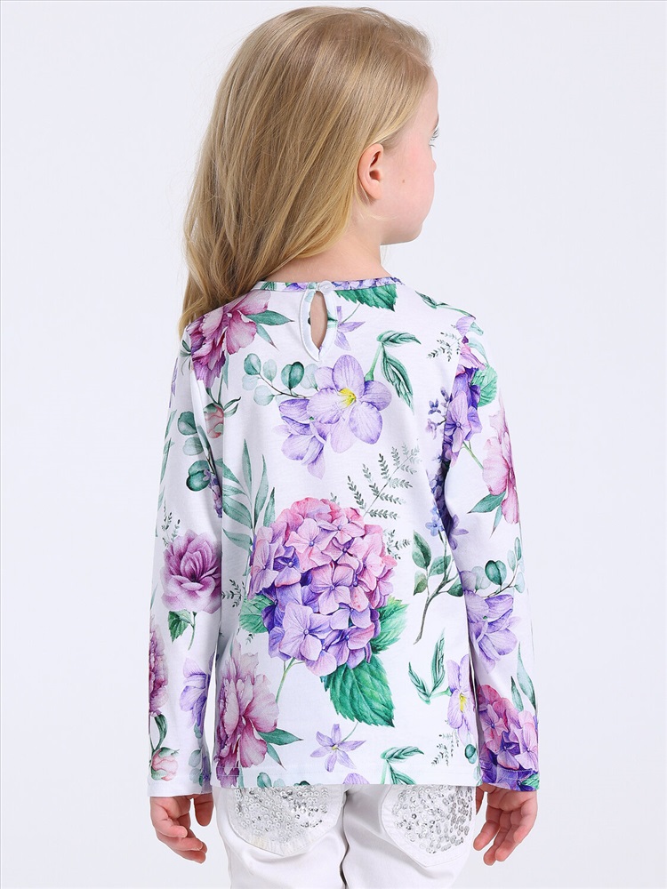 Лонгслив для девочки выполнен из кулира - тонкого хлопкового полотна. Изделие с длинными рукавами, по спинке застегивается на пуговку. Уход: только машинная стирка (руками не стирать!) при температуре 40 градусов, без предварительного замачивания.