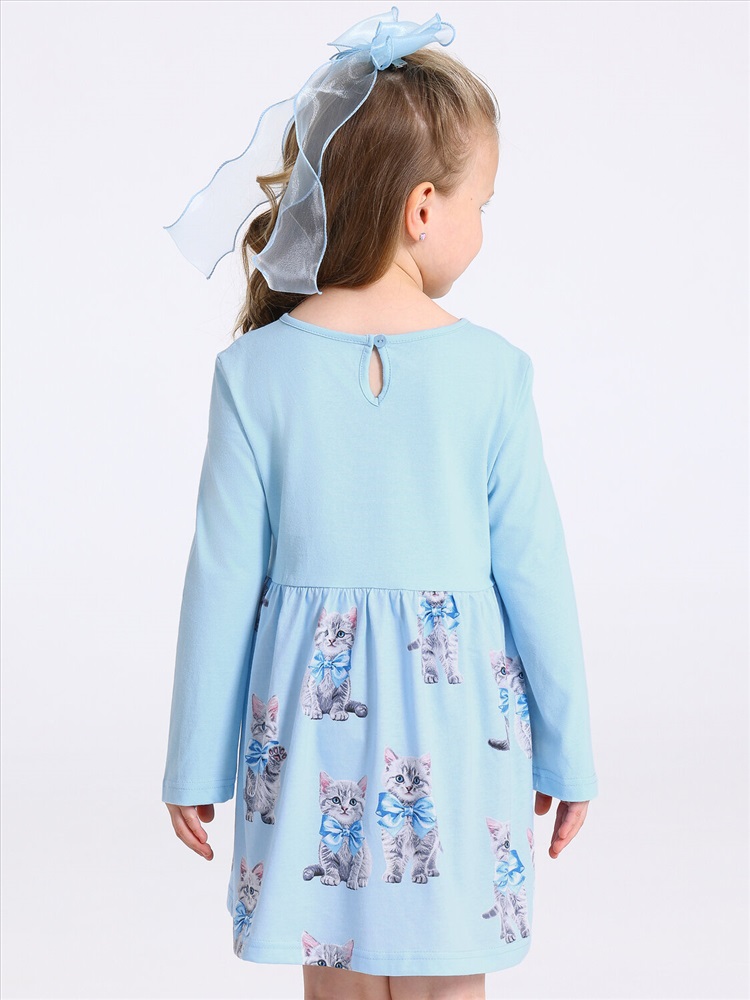 Платье для девочки выполнено из кулира – лёгкого хлопкового полотна. Изделие с длинными рукавами и с присборенной по талии набивной юбочкой, застежка на пуговицу по спинке, полочка украшена печатью. Уход: только машинная стирка (руками не стирать!) при температуре 40 градусов, без предварительного замачивания. Изделия с печатью и декором перед стиркой необходимо вывернуть на изнаночную сторону.