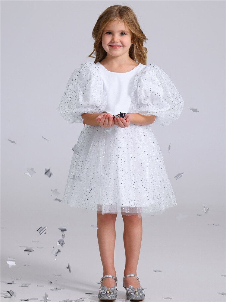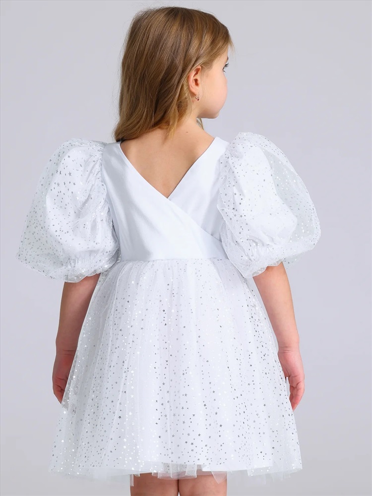 Российский размер: 104 Рост: 104 Возраст: 2-4 Обхват груди: 54 Артикул поставщика: 1ДПК4595001с Ткань: кулир Состав: хлопок 100% Год: 2025 Страна: Россия Нарядное платье для девочек из тонкого хлопкового полотна с лайкрой. Изделие отрезное по линии талии, с объемными двойными рукавами-фонариками и пышной юбочкой из сетки. Спинка с V-образным вырезом, выполнена на запах. Сетка украшена серебряными звездами. Уход: только деликатная стирка при температуре 40 градусов, без предварительного замачивания. Комментарии к товару
