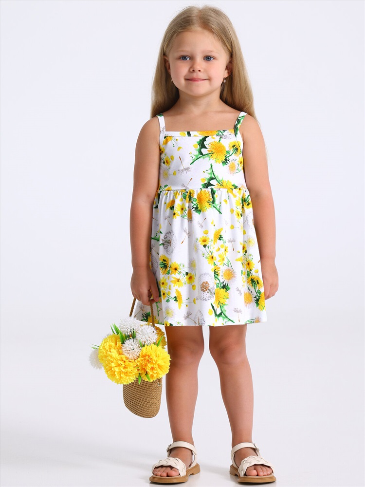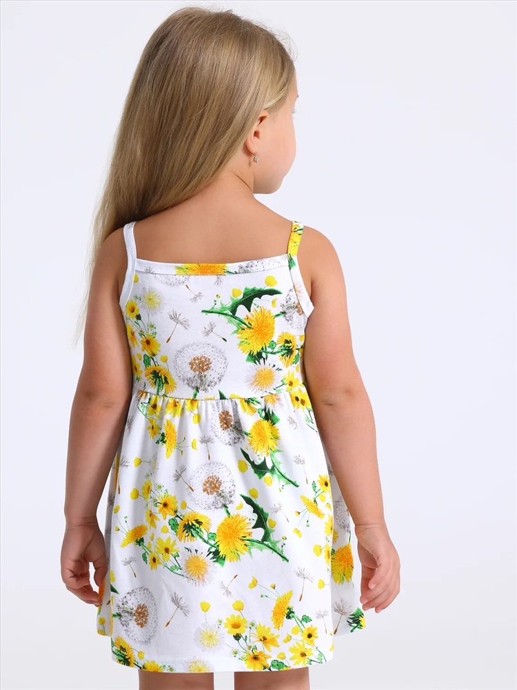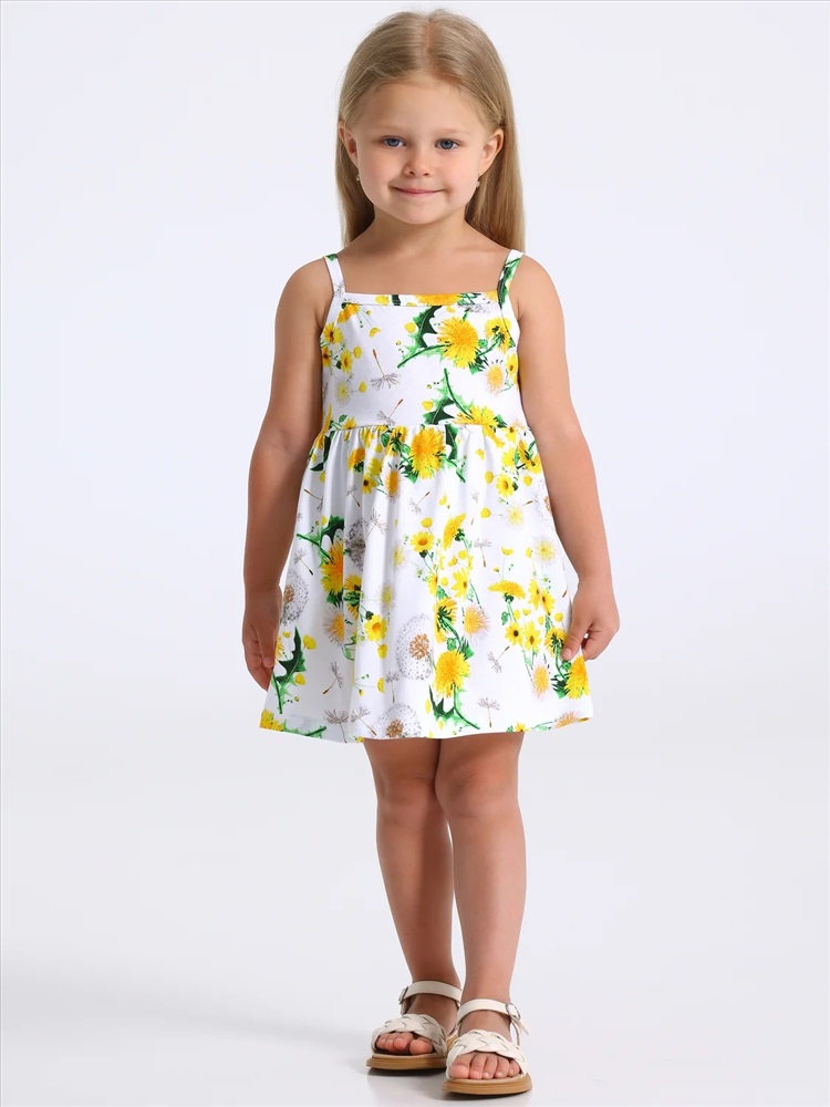 Страна: Россия Сарафан для девочки выполнен из кулира - легкого хлопкового полотна. Изделие на тонких бретелях и с расклешённой юбочкой. Отличный выбор для жаркого летнего дня! Уход: только машинная стирка (руками не стирать!) при температуре 40 градусов, без предварительного замачивания.