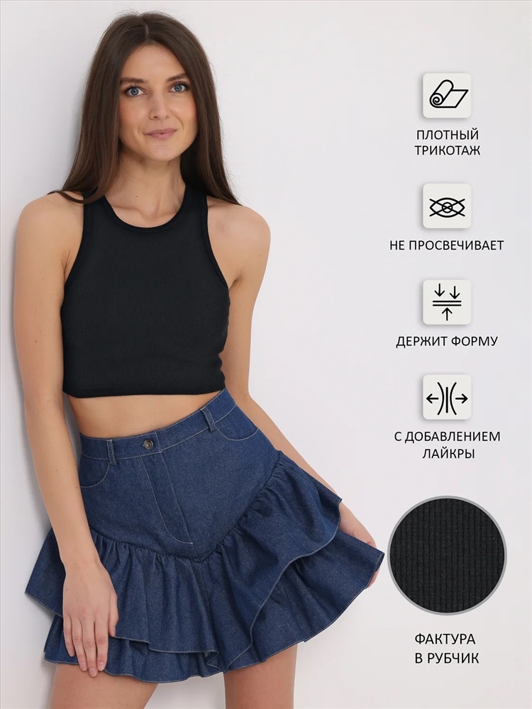 Укороченный топ выполнен из эластичного хлопкового полотна в рубчик. Изделие без рукавов и округлым вырезом горловины. Отлично сочетается с жакетами, рубашками, кардиганами. Уход: только машинная стирка (руками не стирать!) при температуре 40 градусов, без предварительного замачивания.