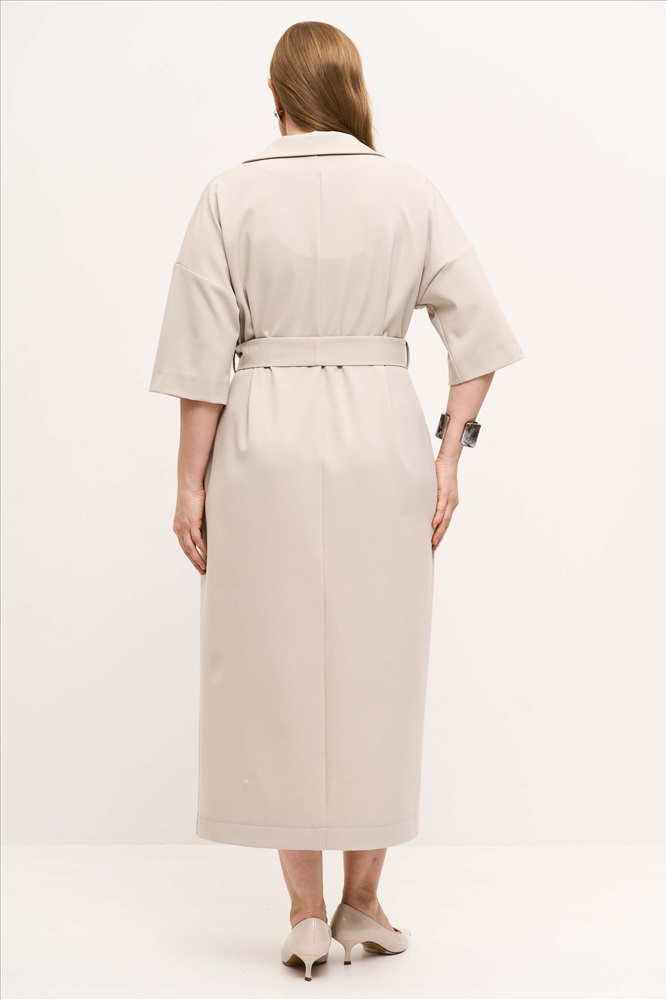 Платье с акцентным воротником и лацканами в благородном оттенке. Модель прямого силуэта. Спущенное плечо, лиф на запах, наклонные карманами по переду. В комплекте пояс. Изделие из костюмного полотна.