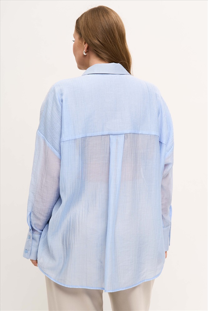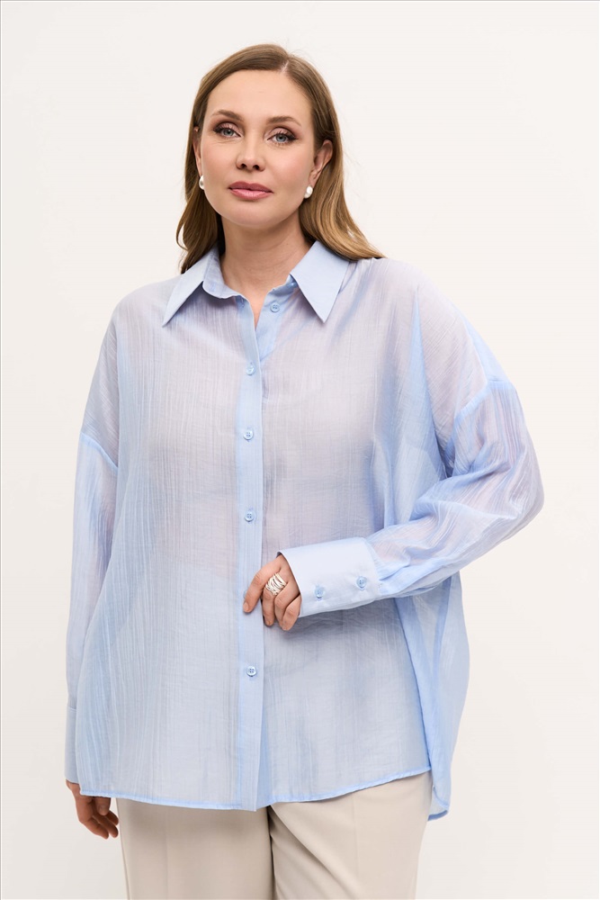 Состав: 85% Вискоза 15% Нейлон Длина: 74 см. Цветовая гамма: Голубой Силуэт: Свободный Принт: Нет Коллекция: Большие размеры Весна #1 Свободная блуза- рубашка со спущенным плечом. Застежка на пуговицы и петли, отложной воротник на стойке, фигурный низ, на спинке кокетка и складка. Рукава с манжетами. Комментарии к товару
